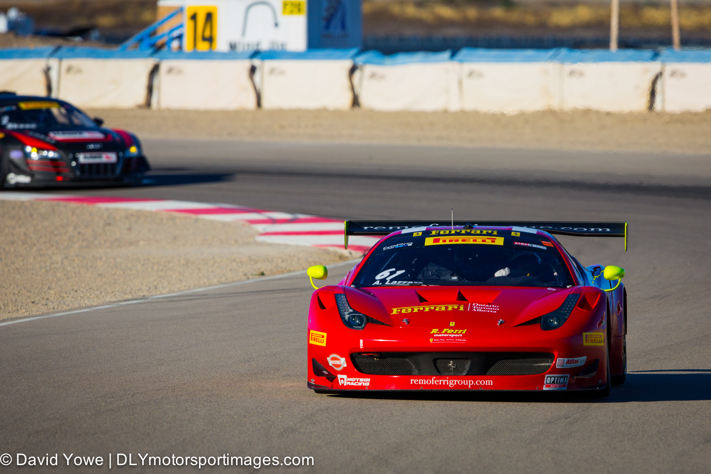 Up close with Anthony Lazzaro in the #61 R. Ferri Motorsport Ferrari 458 GT3 Italia as he leads an Audi R8 through Turn 22 (Canon 5D Mark III, Canon 500mm f/4L, f/5.6, 1/1000, ISO 100)