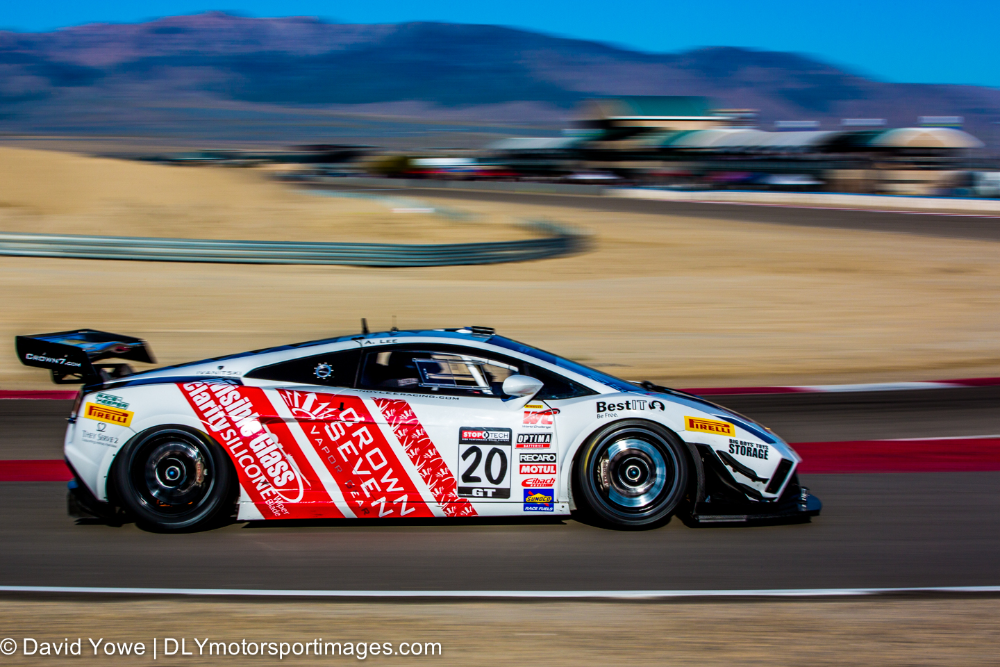 Moving back to your left you can get panning shots of the cars as they enter the pit lane entrance with the mountains in the background as shown here with Andy Lee in the #20 Laguna crown Lamborghini Gallardo FL2 (Canon 5D Mark III, Canon 70-200mm f/2.8L, 70mm, f/25, 1/100, ISO 100)