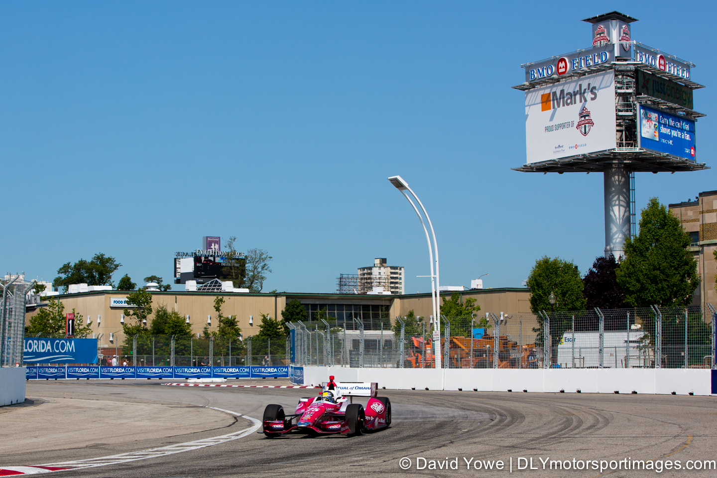 The race was held on the streets at Exhibition Place in Toronto Canada. The street circuit is 11 turns and is about 1.8 miles in length. For the Friday practice session photographed the cars on the outside of Turn 10. This was a great location to shoot from since you could get shots of the cars coming into and through the “S” corner, then exiting into the short Turn 10 to 11 straight. Here’s Marco Andretti in the #25 Andretti Autosport exiting Turn 10 (Canon 5D Mark III, Canon 70-200mm f/2.8L IS II, 200mm, f/8, 1/1000, ISO 100)