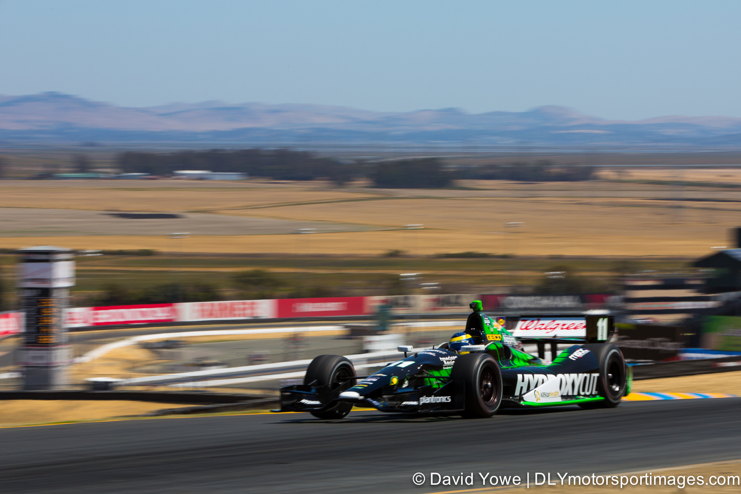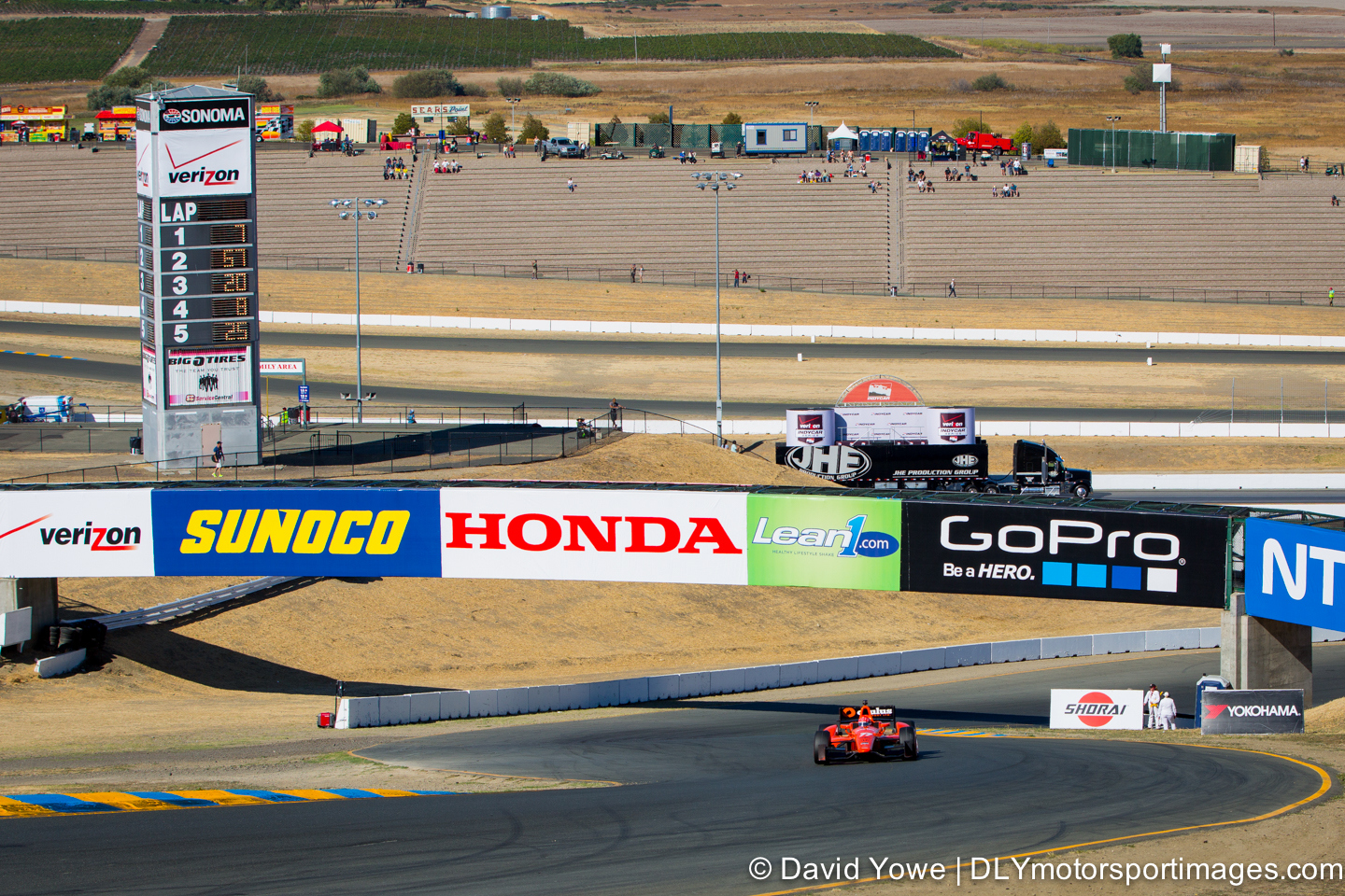 For the first part of the qualifying session started at Turn 3A at the top of the race course. This way I could start the shoot at the top of the hill, then work my way down to the pits and front straight for the “placing of the sticker” by the top qualifier. Here’s Carlos Munoz in the #34 Andretti Autosport – HVM Racing at speed with the Sonoma Valley in the background (Canon 5D Mark III, Canon 70-200mm f/2.8L IS II 1.4x extender III, 135mm, f/14, 1/160, ISO 100)