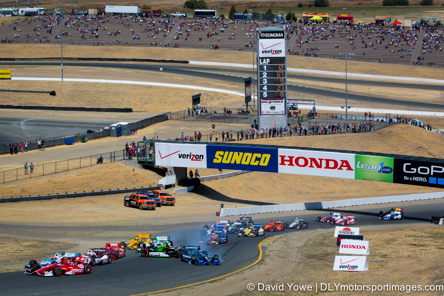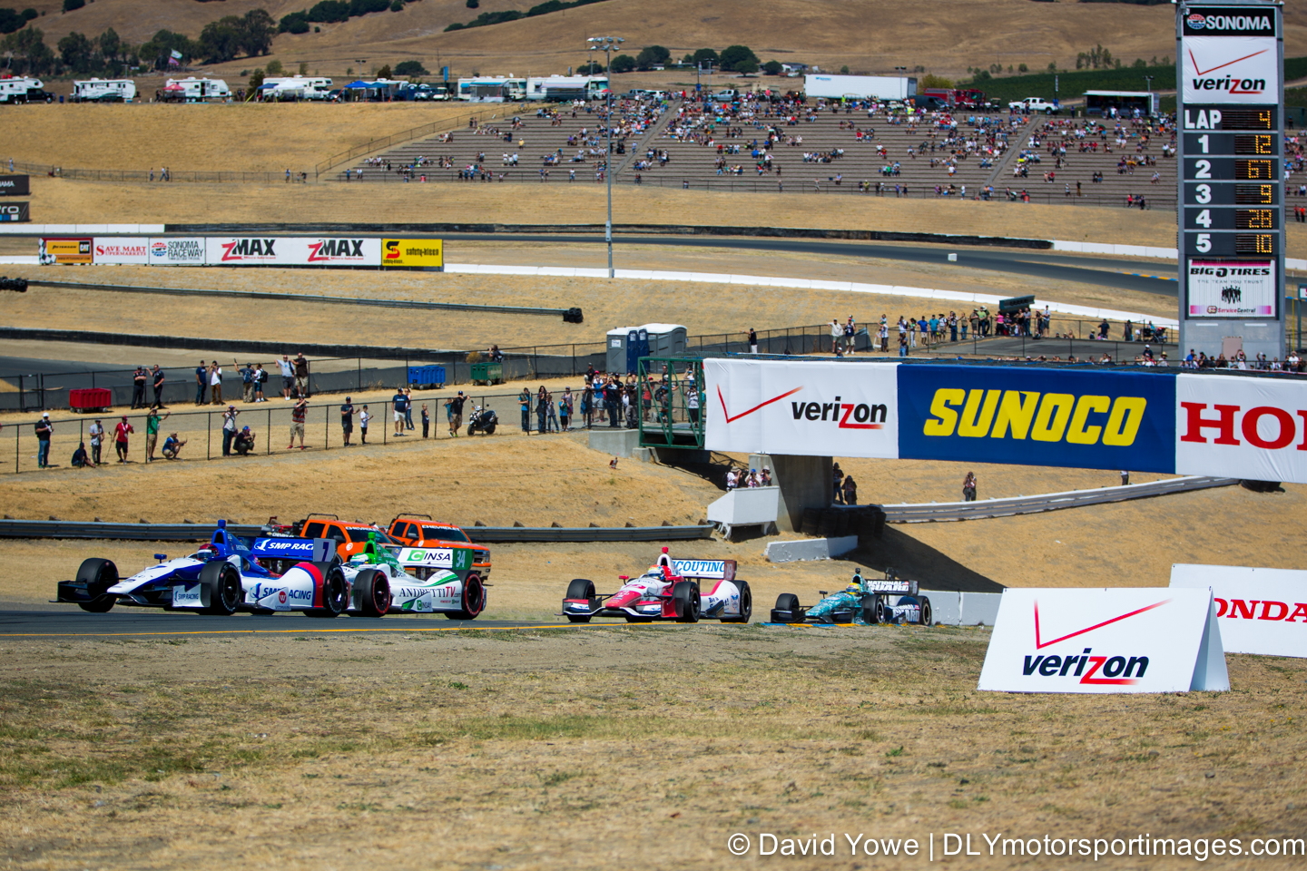 Decided to cover the start of the race from the top of the track above the spectator area so could capture the cars as they raced up the hill into Turn 2. Here’s a couple of shots from the start, which includes the mid-field collision between Ryan Briscoe in the #8 NTT Data Chip Ganassi Racing and Sebastien Bourdais in the #11 KVSH Racing (Canon 5D Mark III, Canon 70-200mm f/2.8L IS II with 1.4x extender III, 98mm, f/16, 1/1000, ISO 100)