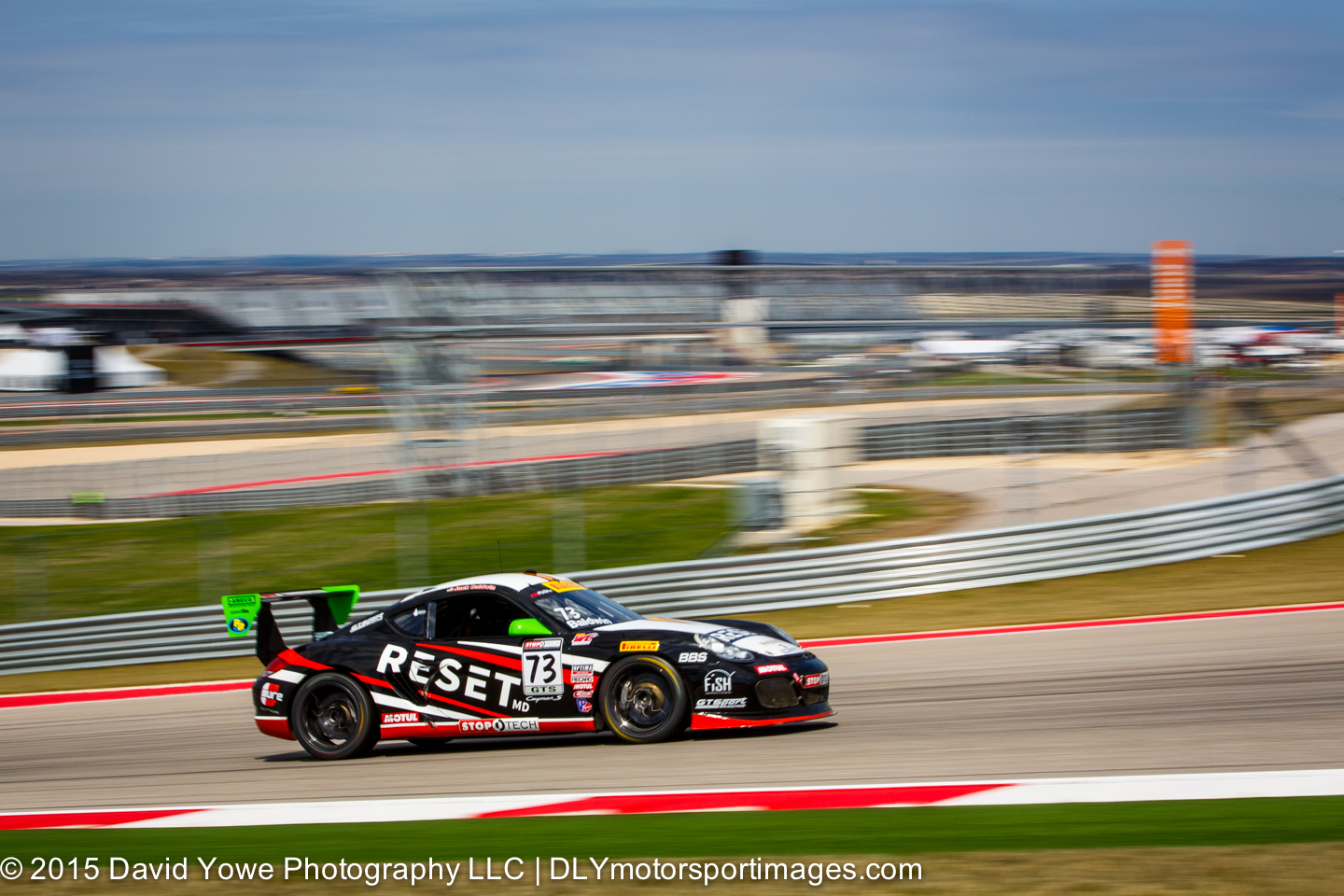 “Speeding up the hill” into Turn 1 with Jack Baldwin in the #73 GTSport Racing Porsche Cayman S.