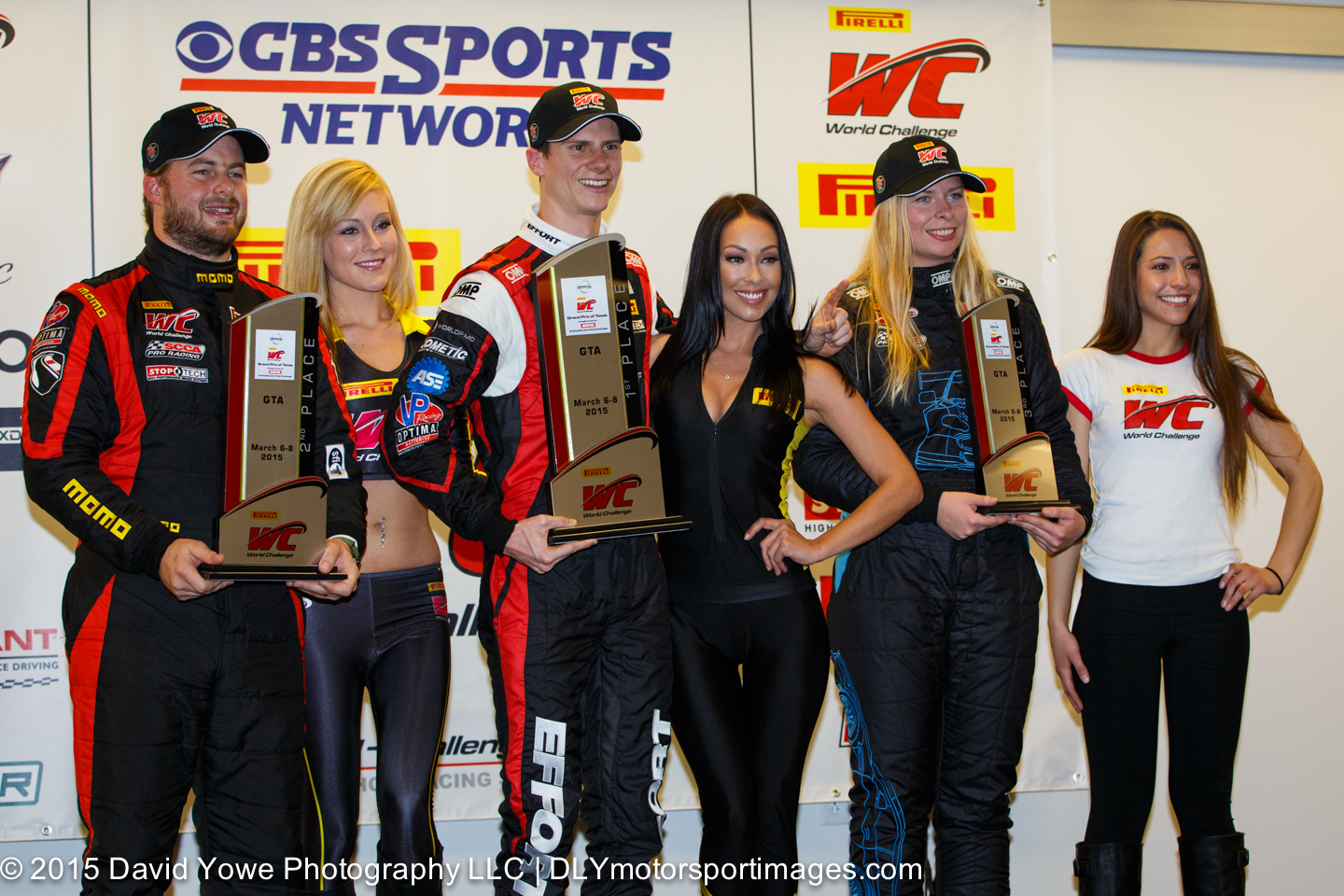 GTA winners podium with Michael Lewis (first, center), Henrique Cisneros (second, left), and Christina Nielsen (third, right).