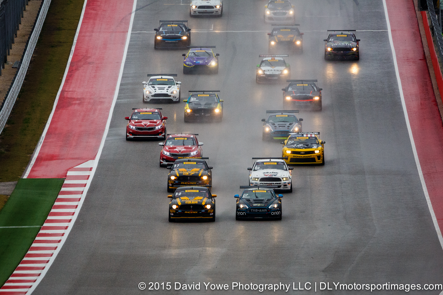 With headlights ablaze, Kris Wilson in the #07 TRG-AMR Aston Martin Vantage GT4 and Andrew Aquilante in the #32 Phoenix American Motorsports Ford Mustang Boss 302 lead the field into Turn 1.