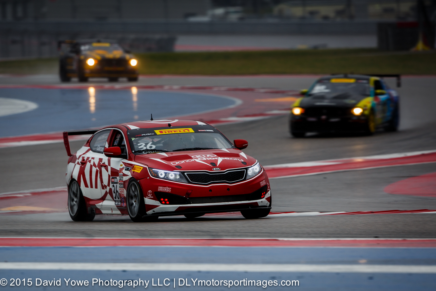 Through Turn 1 with “Kia Kia”. Ben Clucas in the #36 and Mark Wilkins in the #38 Kinetic Motorsports/Kia Racing Kia Optima’s.