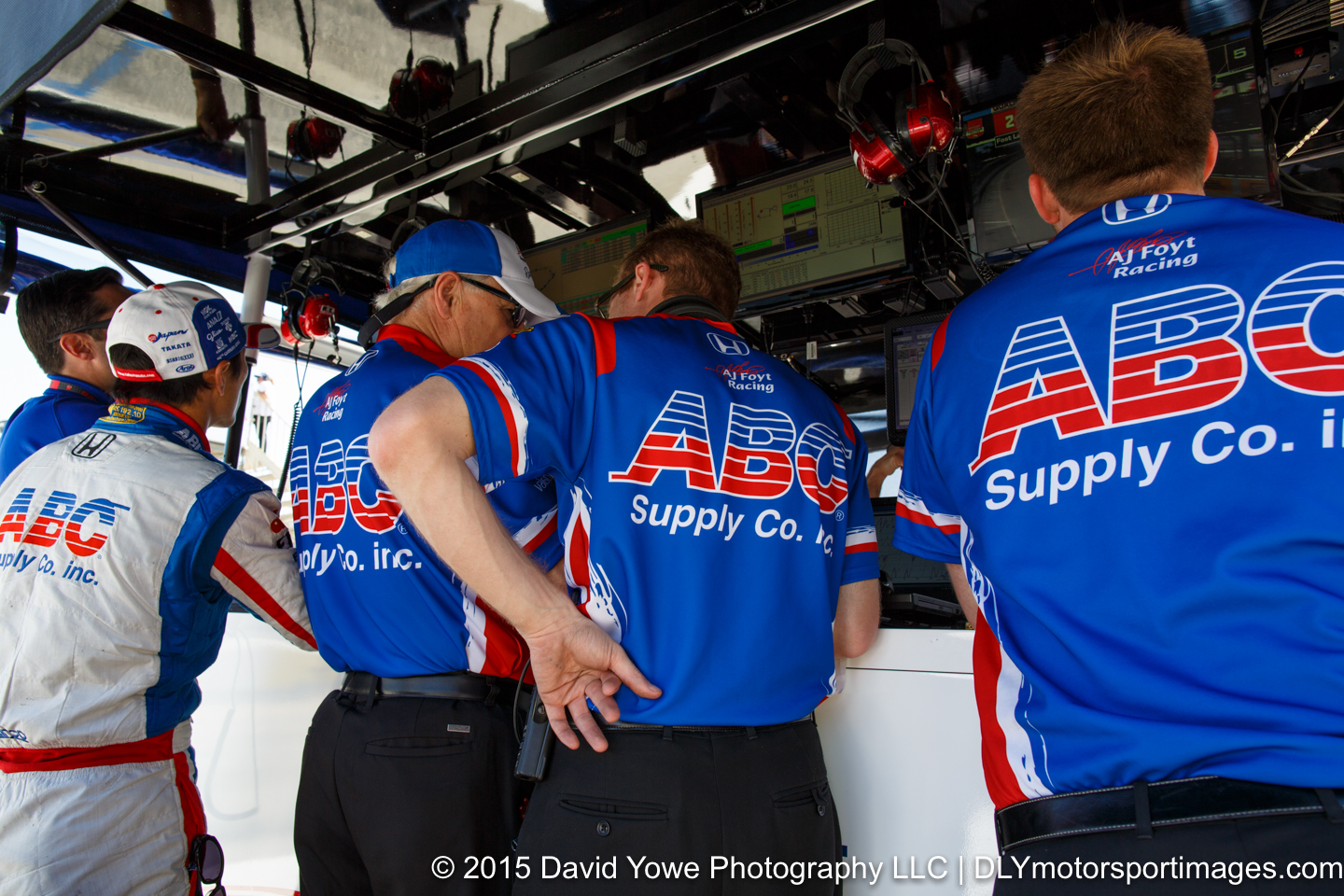 Takuma Sato (left) studying the live timing screens with other A.J. Foyt Enterprises Honda team members.