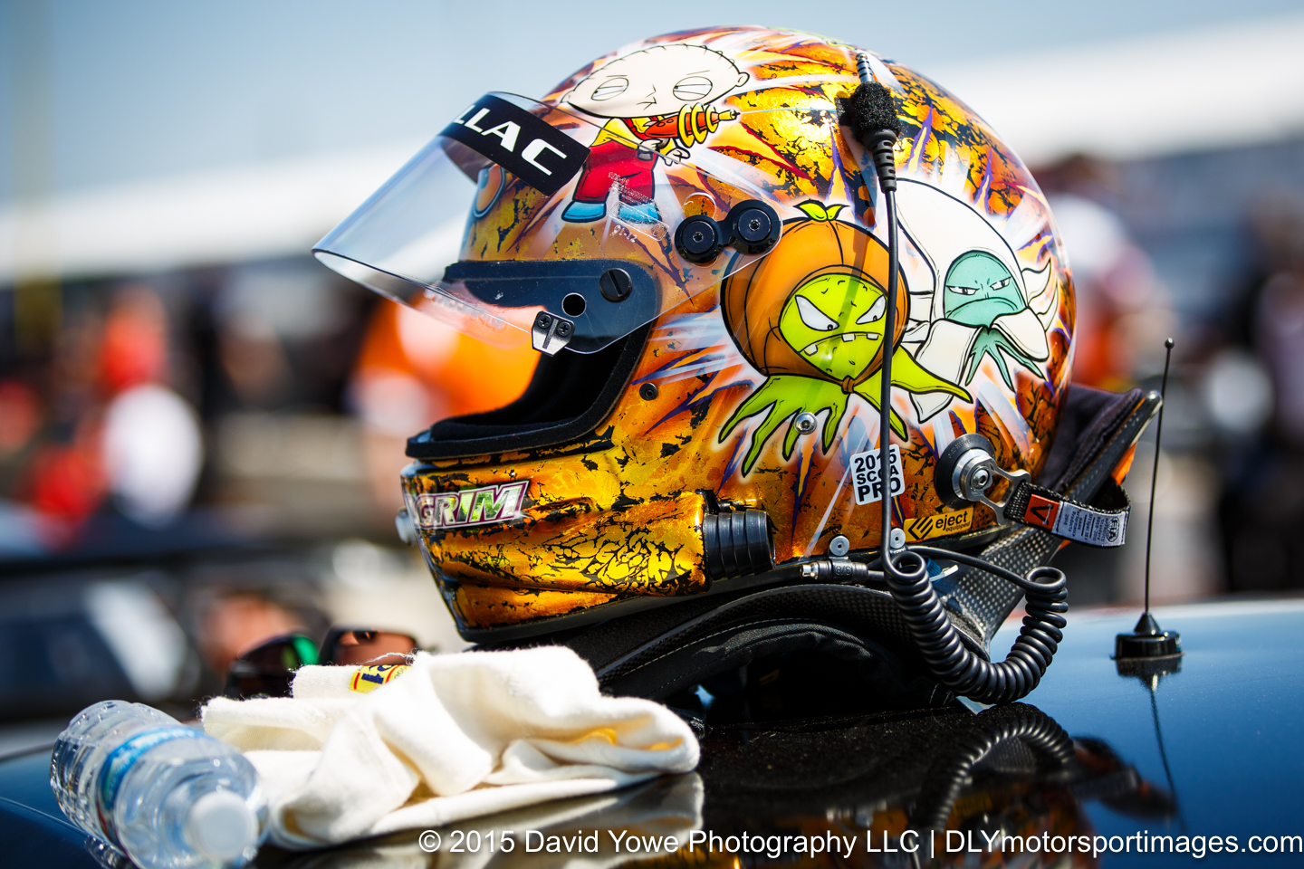 Andy Pilgrim driver of the #8 Cadillac Racing Cadillac ATS-VR GT3 and his helmet.