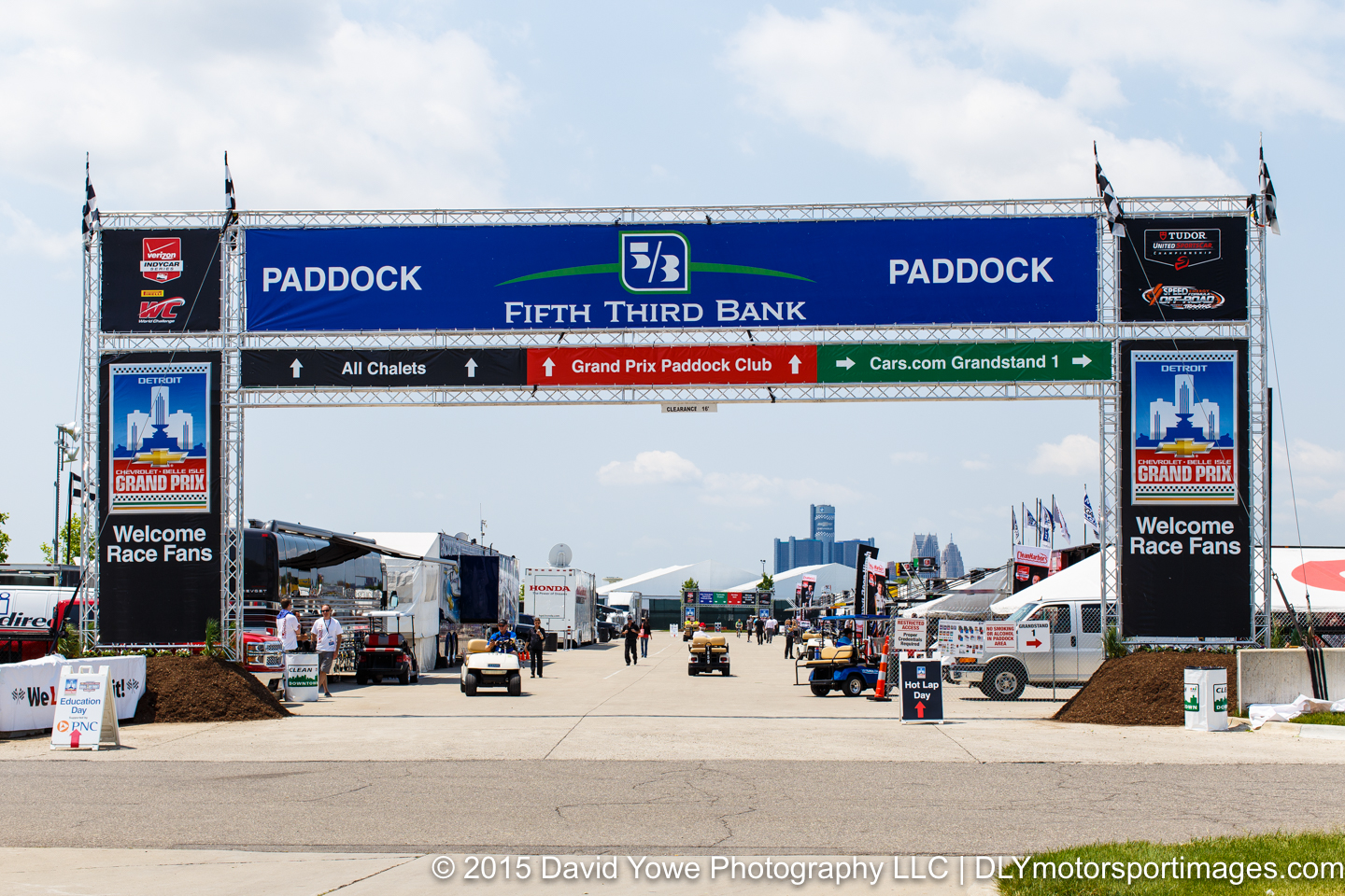 “Welcome race fans” as you enter the Indy Car paddock with the Renaissance Center in the background.