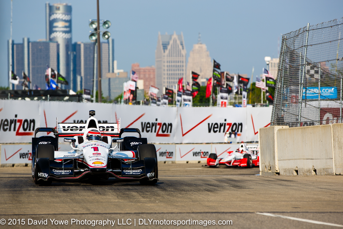 Pole sitter, Will Power in the #1 Team Penske Chevrolet leads team-mate Juan Pablo Montoya through Turn 2 with the Renaissance Center in the background.