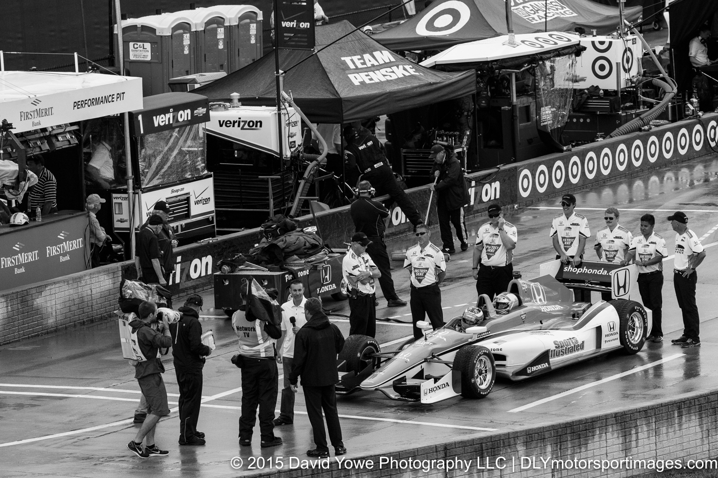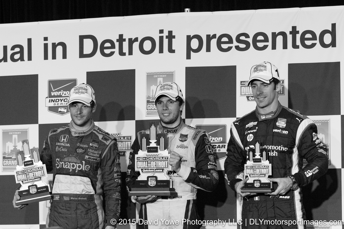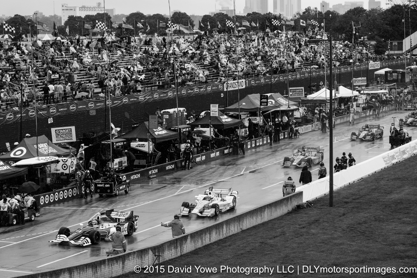 The IndyCar Chevrolet Dual in Detroit Race 1 was held Saturday afternoon under overcast skies and wet conditions. After 47 of the scheduled 70 laps, the race was red flagged due to bad weather. Carlos Munoz won his first IndyCar race in the #26 Andretti Autosport – HVM Racing Honda. Marco Andretti in the #27 Andretti Autosport Honda was second and Simon Pagenaud in the #22 Team Penske Chevrolet was third. This photo story will be in black and white to reflect the bad weather conditions that we experienced during the race. Hope you like the photos.