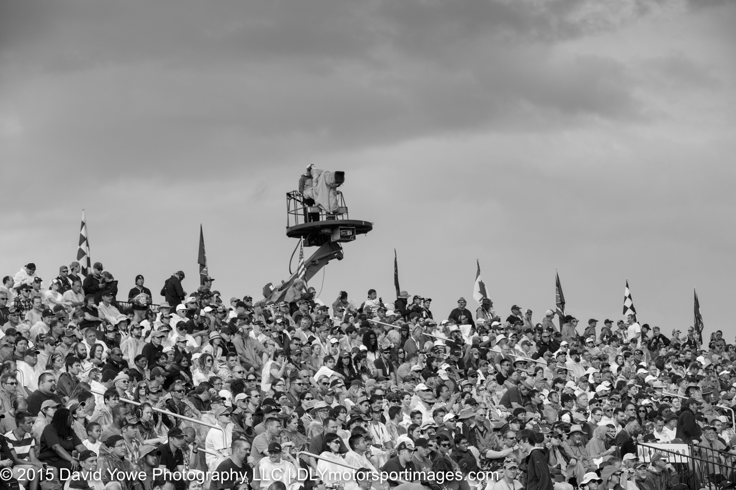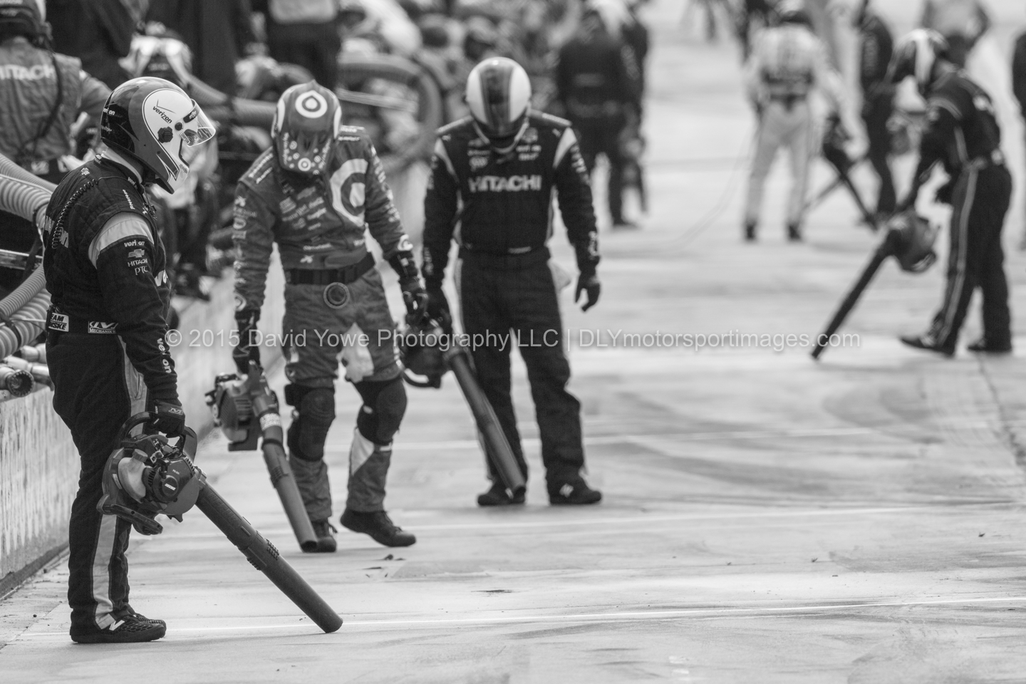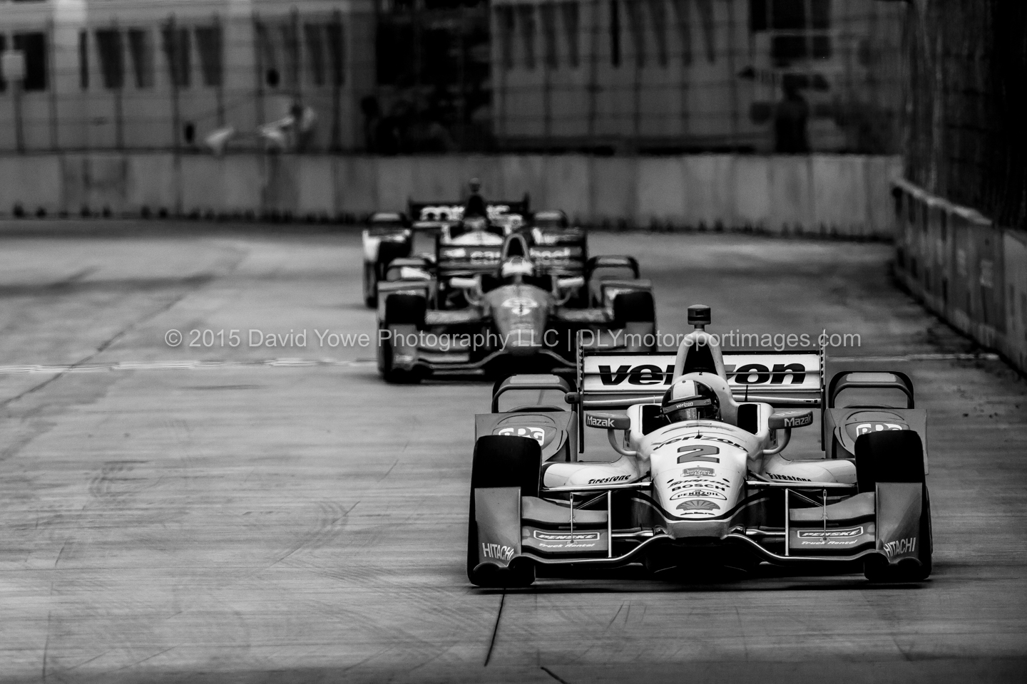 The IndyCar Chevrolet Dual in Detroit Race 1 was held Saturday afternoon under overcast skies and wet conditions. After 47 of the scheduled 70 laps, the race was red flagged due to bad weather. Carlos Munoz won his first IndyCar race in the #26 Andretti Autosport – HVM Racing Honda. Marco Andretti in the #27 Andretti Autosport Honda was second and Simon Pagenaud in the #22 Team Penske Chevrolet was third. This photo story will be in black and white to reflect the bad weather conditions that we experienced during the race. Hope you like the photos.