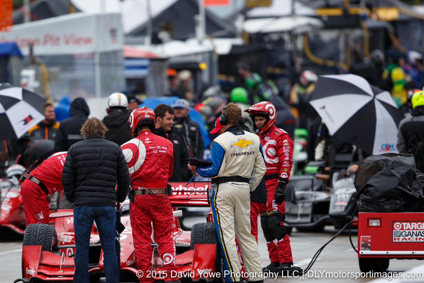 Juan Pablo Montoya being protected from the rain by an umbrella in his #2 Team Penske Chevrolet.
