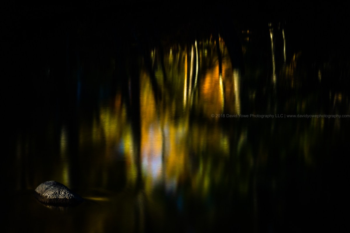 After getting the getting the photos above, started to look around for other photo opportunities. Noticed a rock amongst the reflections of trees near the left side of the river bank. Thought this might make an interesting abstract photo. So used an ND filter and a long exposure of 20 seconds to soften and blend the reflections, which resulted in a water color-like effect.