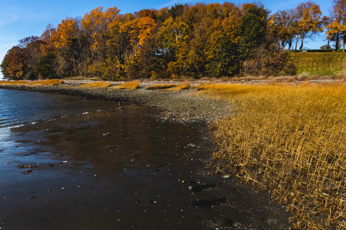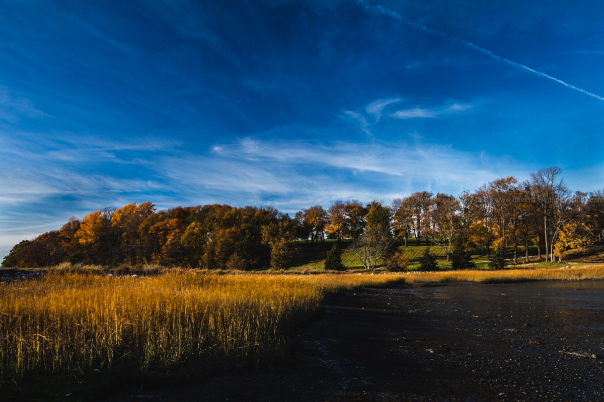 After entering the reservation, there is a bridge which takes you across a small tidal inlet to the first drumlin. Once again, the soft early morning golden light made the salt marsh and fall foliage glow.