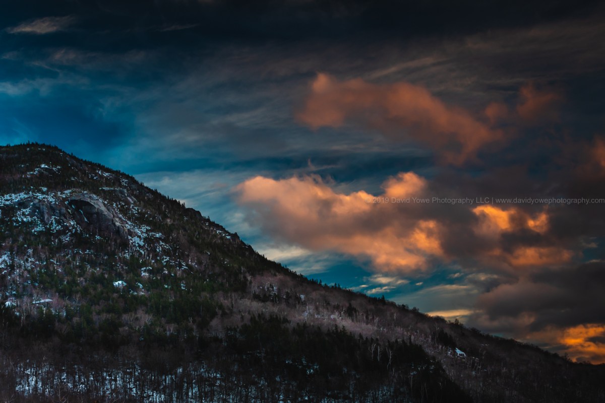 Since the weather wasn’t clearing, continued driving along I93N, to Route 302, through Jackson, then to Route 16 on the north-east side of the White Mountains. By this time it was mid-afternoon and the strong wind was starting to clear the clouds from the sky, so stopped at the roadside lookout near Glen Ellis Falls. It was so windy that after I set-up my tripod, it was blown over. Luckily it fell on a snow bank, and my camera wasn’t attached. I said to myself “lesson learnt, hold onto your tripod when a strong wind is around”. Spent several moments watching the wind interact with the clouds over the mountain ranges and looked for interesting compositions. Saw this beautiful cloud formation over a nearby mountain summit, so quickly took the photo, since moments later it was gone due to the strong wind pushing the clouds away.