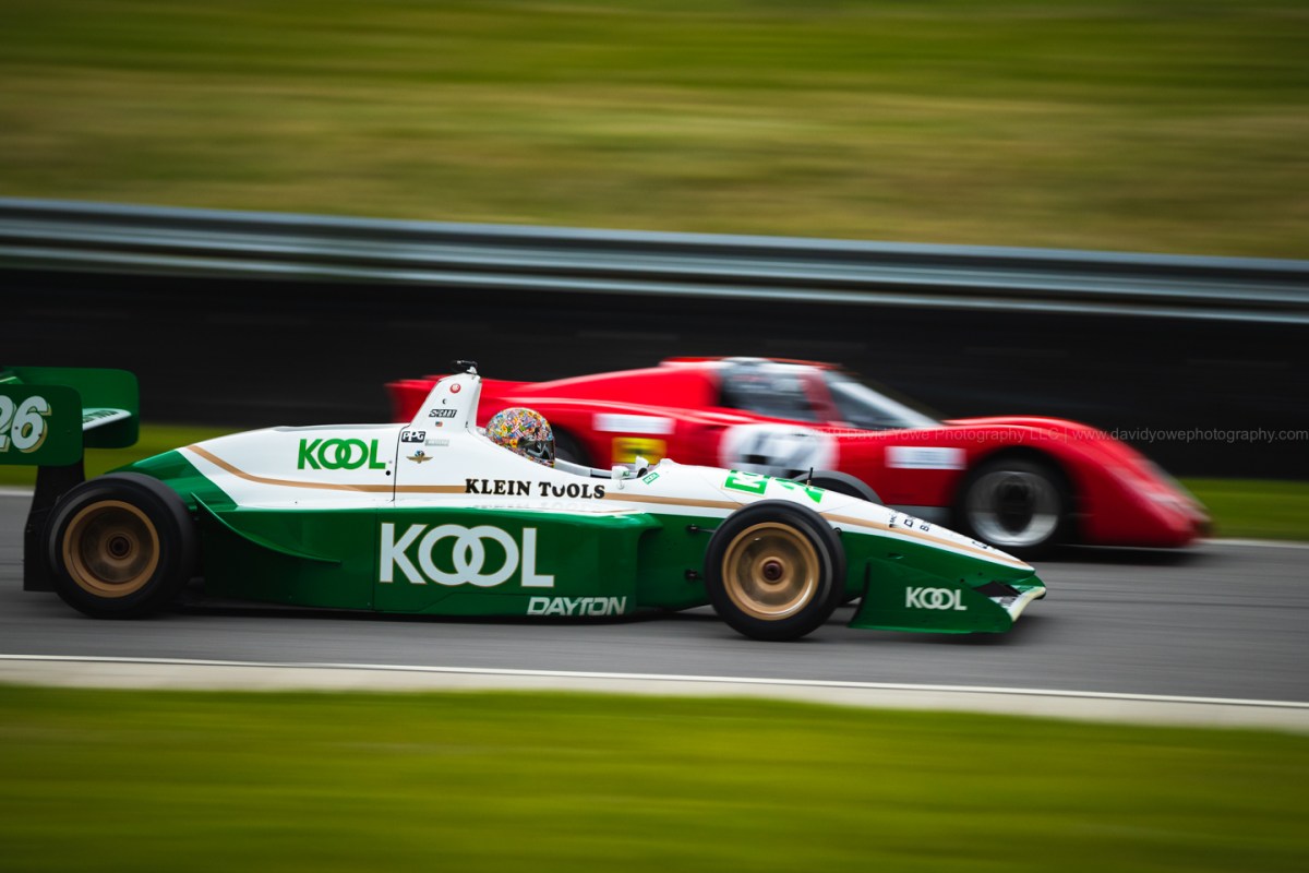 Walked through the camp ground area to the midway and down the hill through the field spectator area to the Esses. This part of the race track is a great location to get ground level photographs of the cars, as well as variety in your shots ranging from front, 3/4 front, panning and rear angles. One of my favorite SRVA cars that I saw this weekend, was the KOOL T97 Indy Lights car shown above. Really like the classic livery and design of this car. Made a mental note to get more shots of this car over the weekend. This photograph also gives you an idea of the beautiful trees and grass that line this race track.
