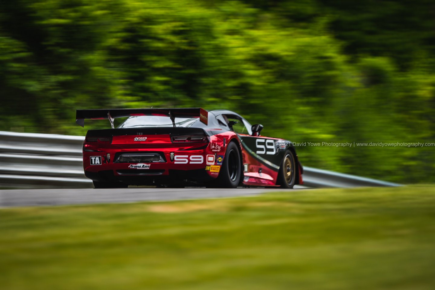 The optional testing session for the TA/XGT/SGT/GT class started at 11.45 am, so got into position for photographing some 3/4 rear away shots of the cars as they sped along West Bend to the downhill under the car bridge. In a way, this was also a test session for me, since its been about 20 months since I’ve photographed a motorsport event. Here’s the #59 The Peter Gregg Foundation Chevrolet Camaro with its brilliant metallic red paint work.