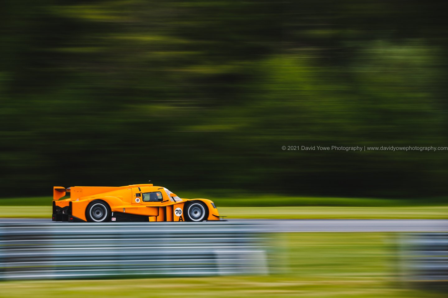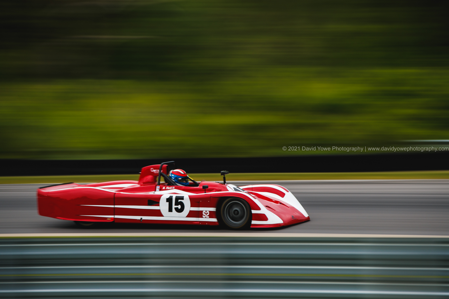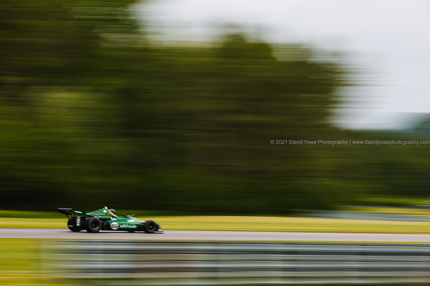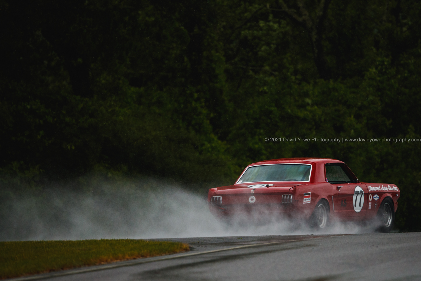The Saturday morning practice sessions started under overcast skies with rain falling, so went to the straight between the Uphill and Westbend for photos of the cars with “rooster tails” of water spraying behind them.