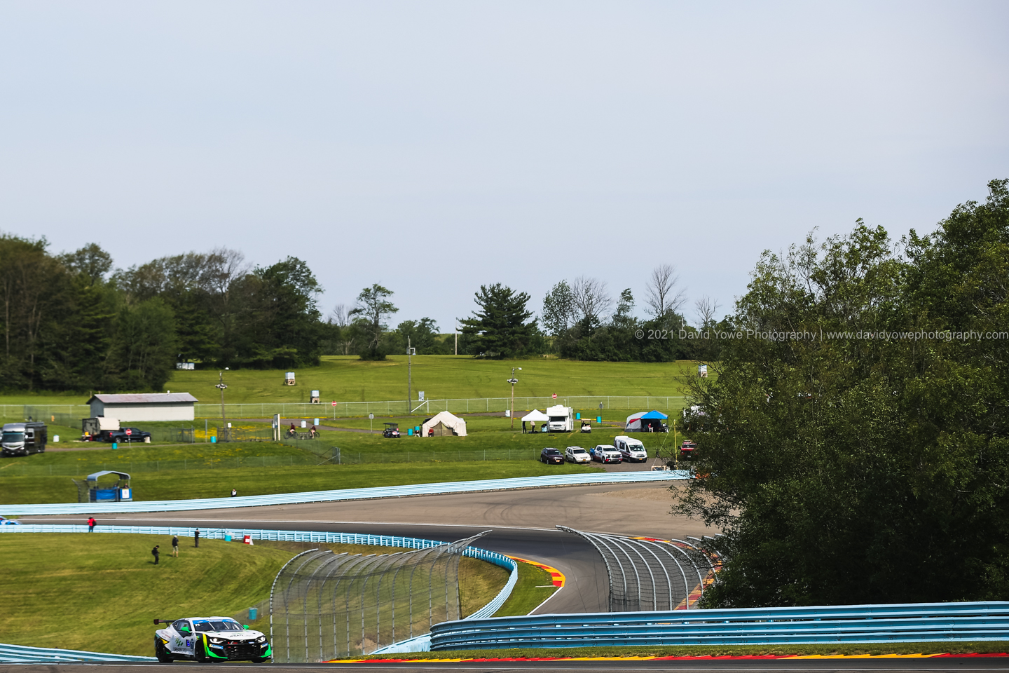 As the session progressed, moved to my left for shots of the cars as they come over the top of the Boot. First went for a wide shot to capture the ambience of this part of the track. Then a tight shot, where I tried to frame the front of the car so it is parallel to me with a clean background. The #71 Rebel Rock Racing Chevrolet Camaro GT4.R (top) and #93 CarBahn with Peregrine Audi R8 GT4 (bottom).