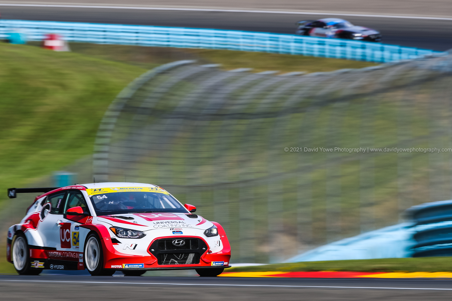 The #54 Michael Johnson Racing Hyundai Veloster N TCR with the characteristic high catch fencing and blue safety railings in the background.