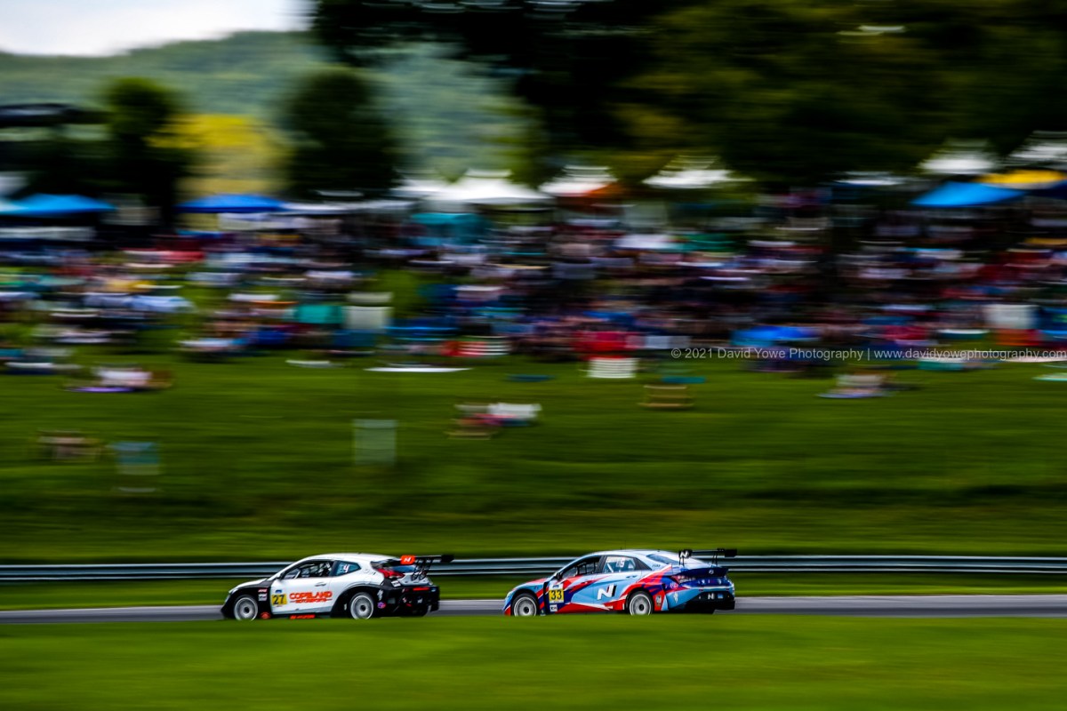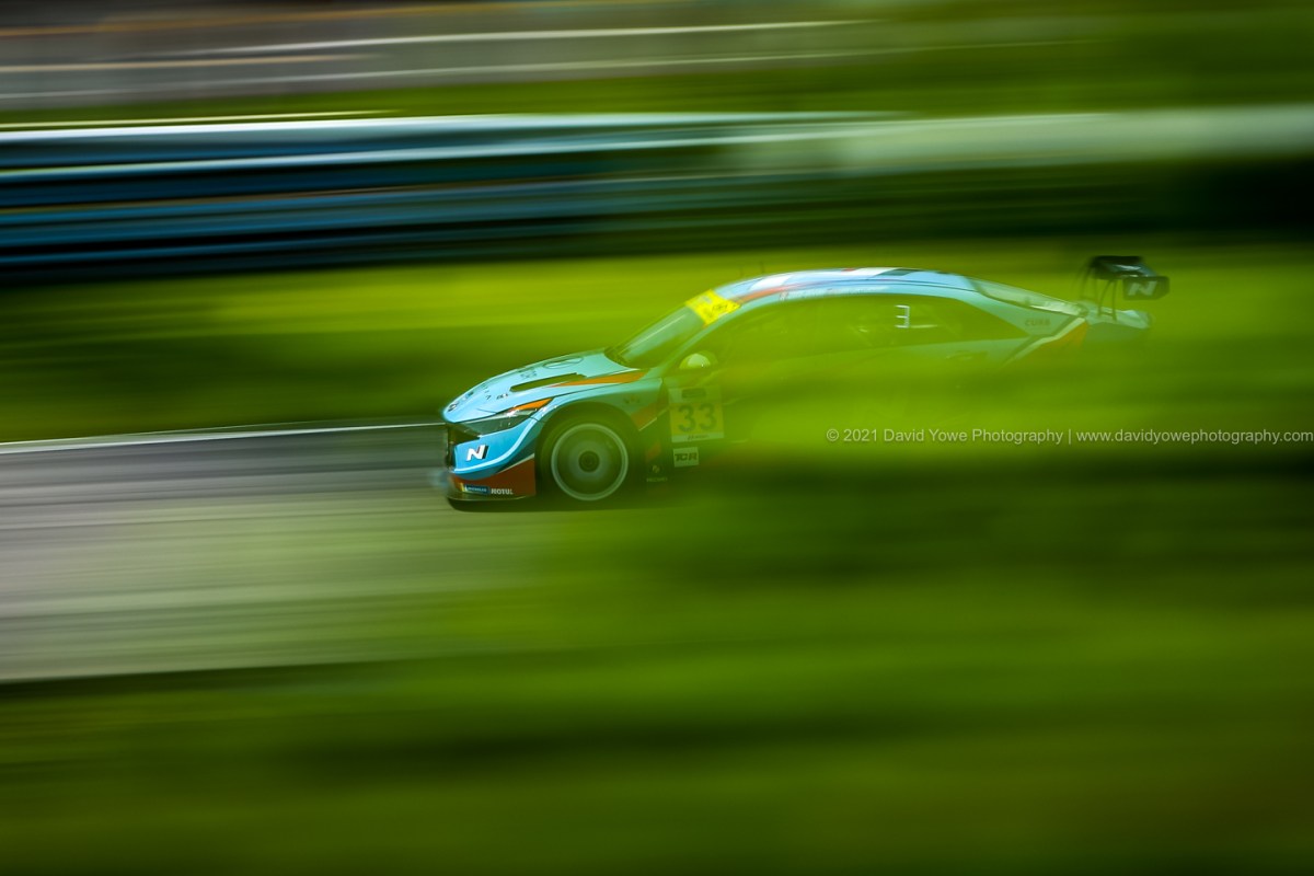 Also tired some slow shutter speed panning shots at a longer focal length as the cars sped through the trees and bushes that line Sam Posey Straight. The #33 Bryan Herta Autosport w/ Curb-Agajanian Hyundai Elantra N TCR.