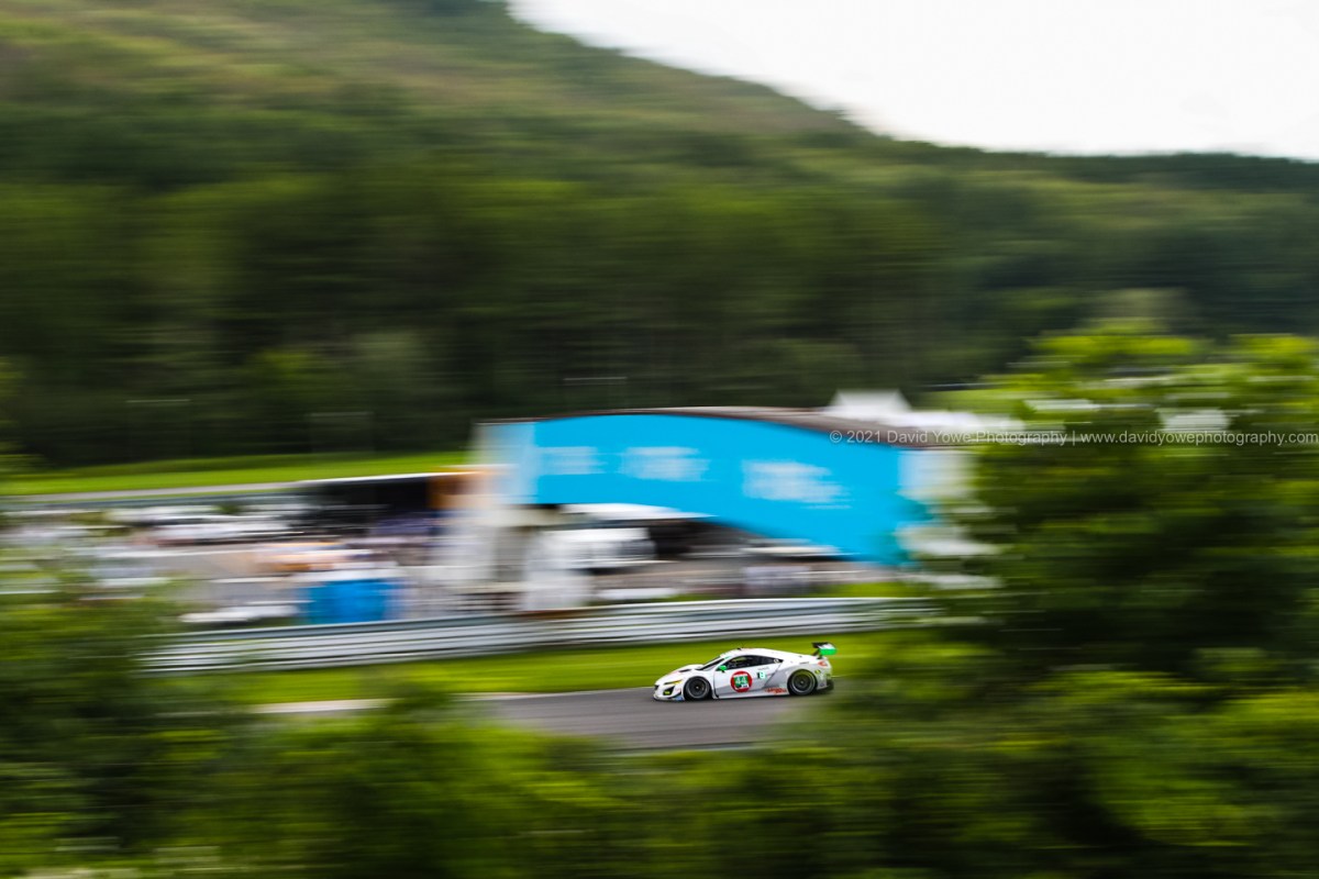 Always amazed at what can happen when you pan at a very slow shutter speed. This photo of the #23 Heart of Racing Team Aston Martin Vantage GT3 was taken at 1/10 sec. The foreground streaks of color are due to the lights from another car as the #23 moves behind it. Whilst, the background is the Infield Spectator hill. Hence, keeping the focus point on the #23 whilst its moving, keeps this car in focus and the foreground and background a blur of colors.