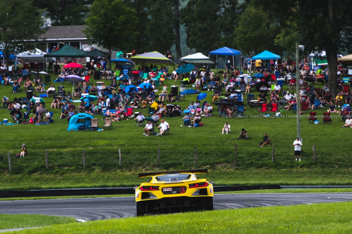 Continued walking in a clockwise direction along Big Bend, then to the Left-hander for rear shots of the cars with fans in the foreground at the Infield Spectator area. The #16 Wright Motorsports Porsche 911 GT3R (top) and the #3 Corvette Racing Corvette C8.R (bottom). The dark clouds would be an ominous warning of what was to come.