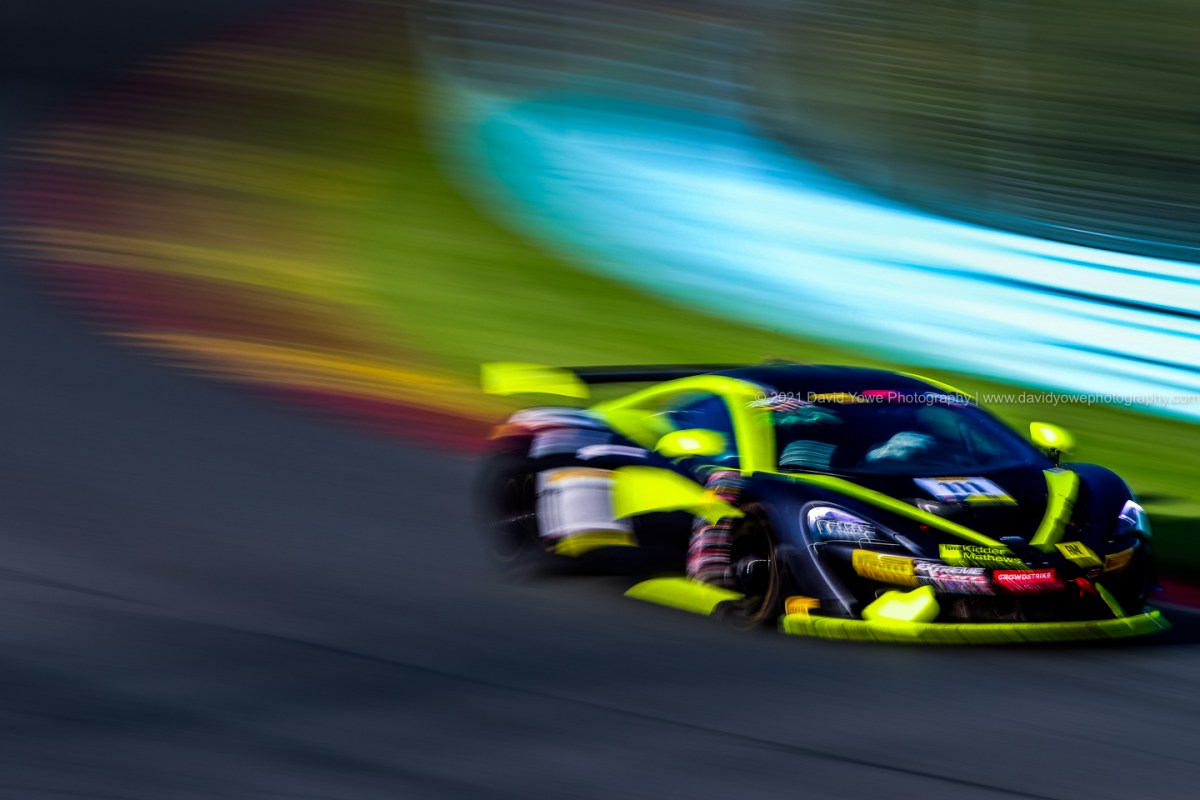Continued getting a mixture of editorial and artsy style photos by varying the angle of view and shutter speed. The #24 Heart of Racing Team Aston Martin Vantage AMR GT4 (top) and #111 Motorsport USA McLaren 570S GT4 (bottom). For the lower artsy photo, was trying to use the slow shutter speed to create the image of the car speeding out of the corner; with a trail of red, yellow and green streaming behind it, against the blue safety railing.