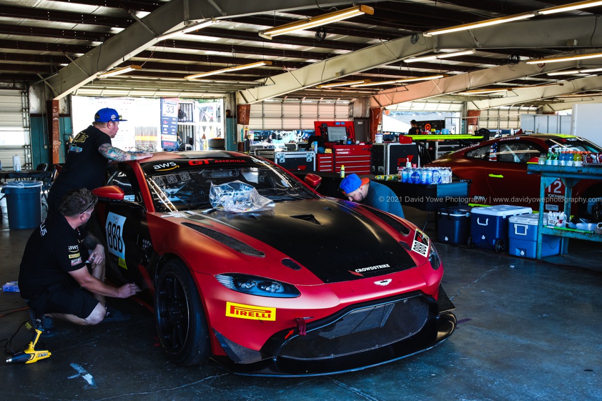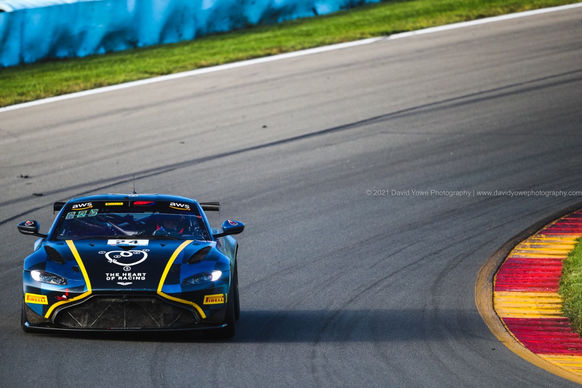 After getting shots of the cars entering Turn 9, moved to my left for panning shots as they entered the straight after Turn 9. The #25 Heart of Racing Team Aston Martin Vantage AMR GT4.