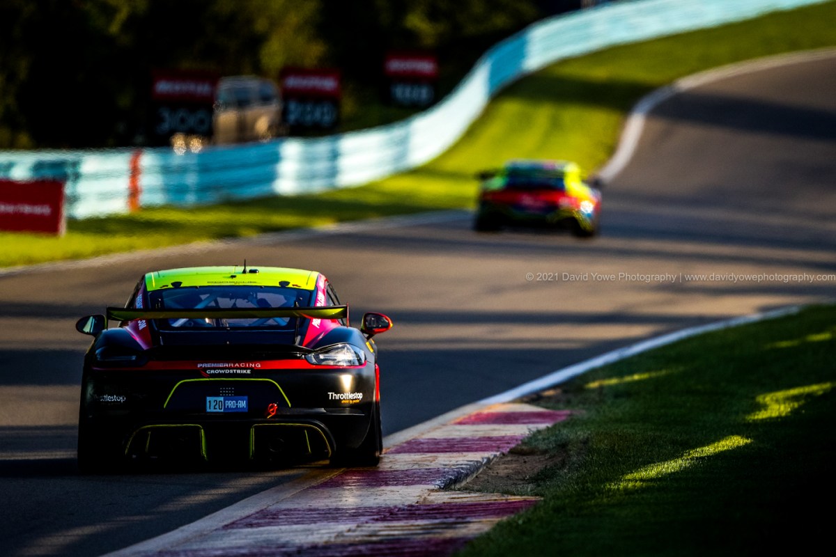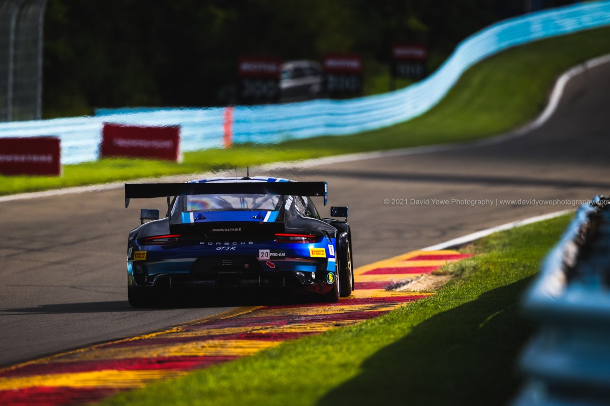 For the 4.00 pm GTWC practice session, continued my routine of starting at one part of Turn 6, then working my way to the other part of this turn as the session progressed. This time started at the bottom of Turn 6 with rear shots of the cars as they turned into the Toe at Turn 7. Some nice light was starting to appear on the track as the sun found its way through the clouds. If you look closely at the #20 Wright Motorsports Porsche 911 GT3-R 991.2 you can see the heat from the engine causing a disturbance in the air above the top of the car.