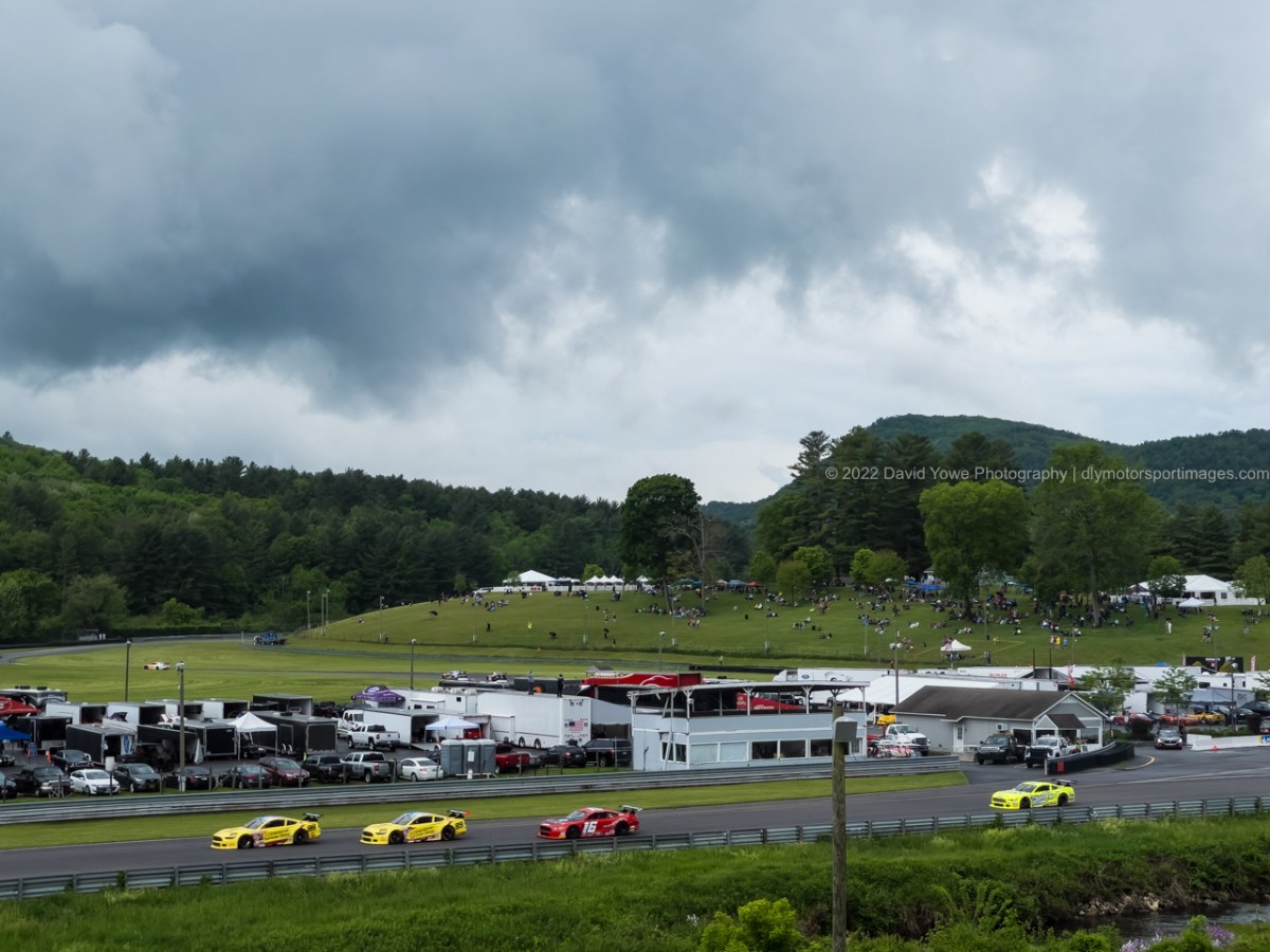 For the start of the 11.50 pm TA2 feature race headed over the bridge to the Outfield Spectator area for a start shot of the cars going along the Sam Posey Straight. The #89 3Dimensional Services Group Ford Mustang led the field of cars across the start/finish line.