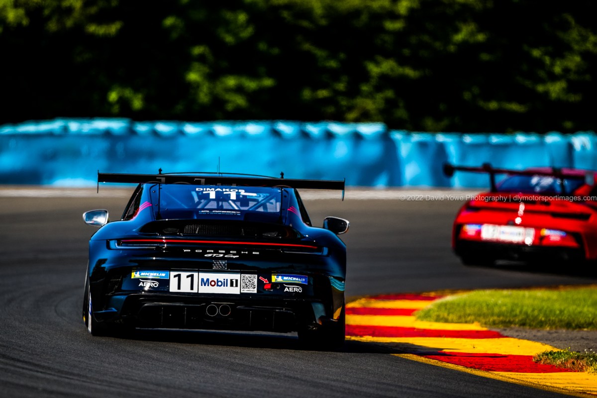 Speeding along the straight into Turn 5 with the #55 Goldcrest Motorsports (top) and #69 BGB Motorsports Porsche 992.