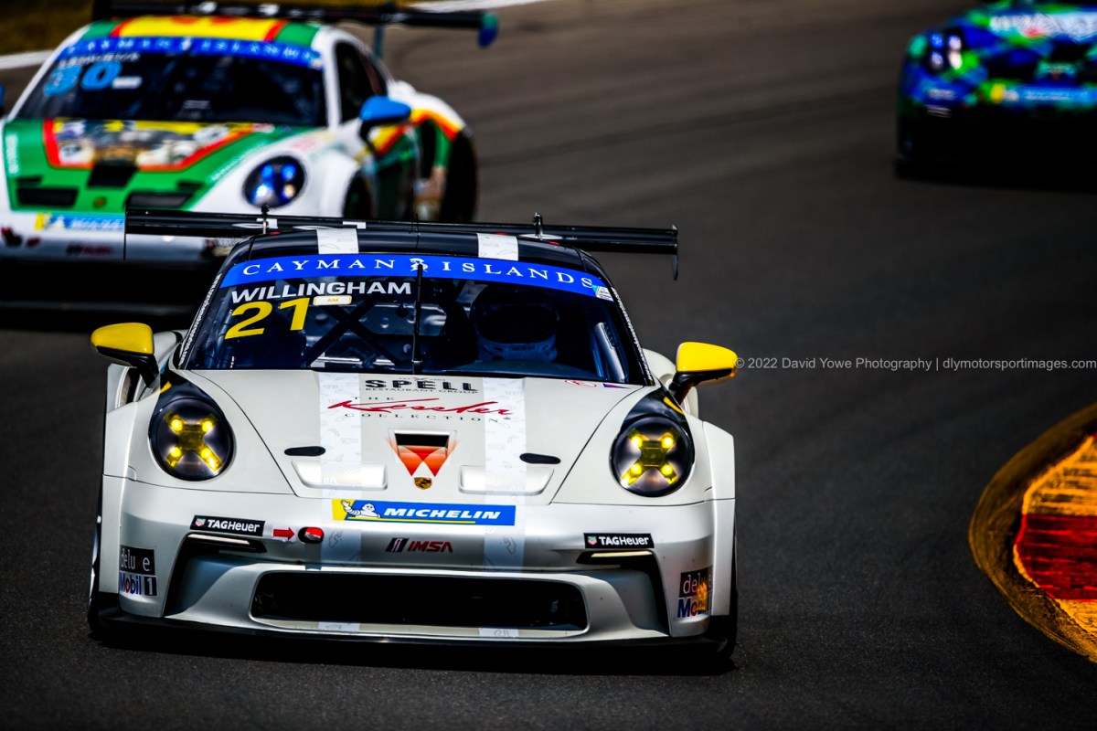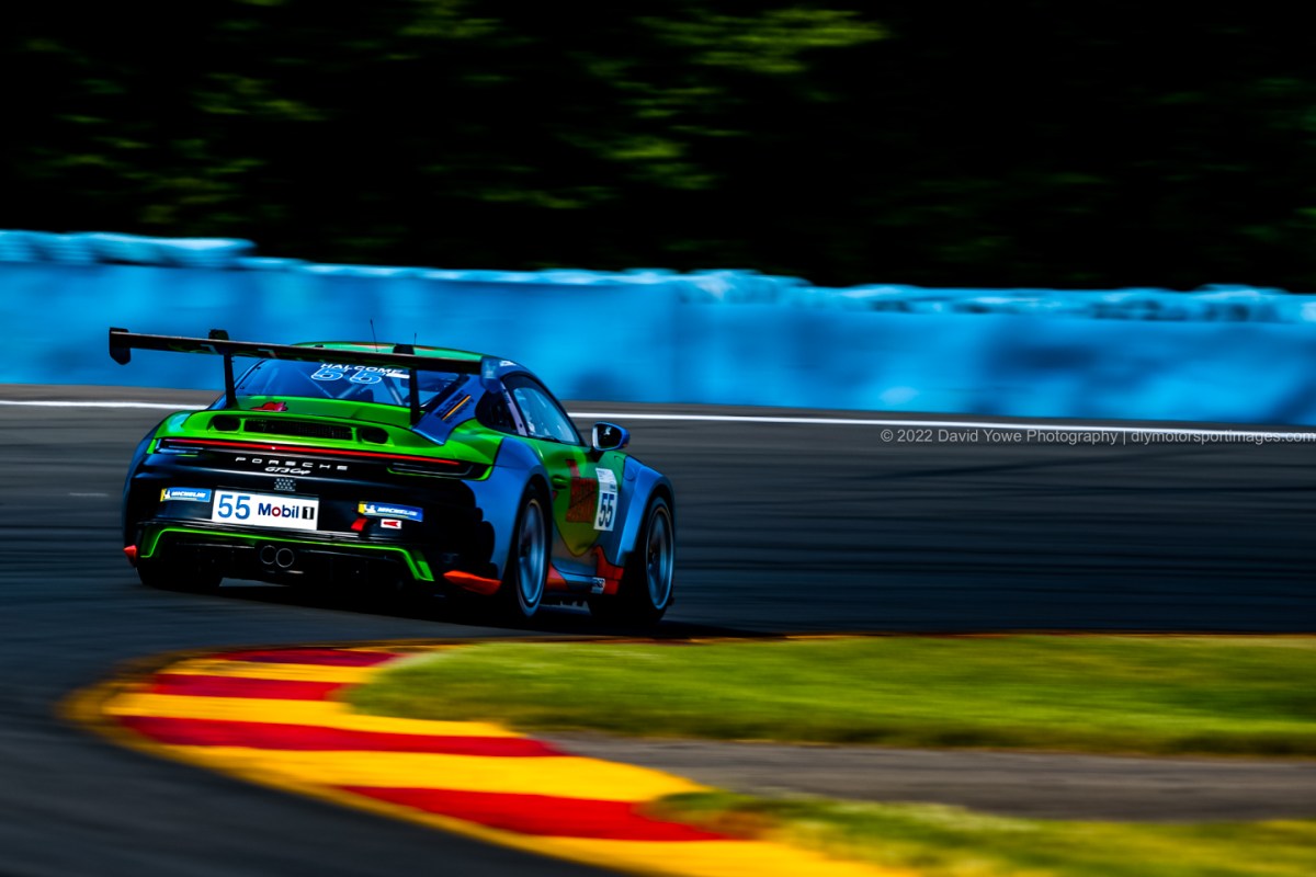 Speeding along the straight into Turn 5 with the #55 Goldcrest Motorsports (top) and #69 BGB Motorsports Porsche 992.