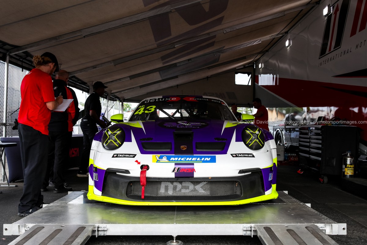 First checked out the Porsche Carrera Cup cars in the garage, at the IMSA Technical Center and being unloaded from their trailers.