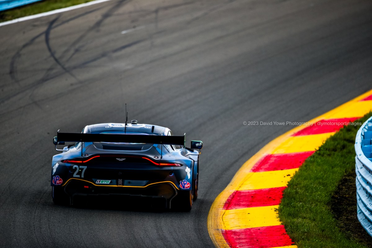 The #27 Heart of Racing Team Aston Martin Vantage GT3 climbing out of Turn 2 into 3.