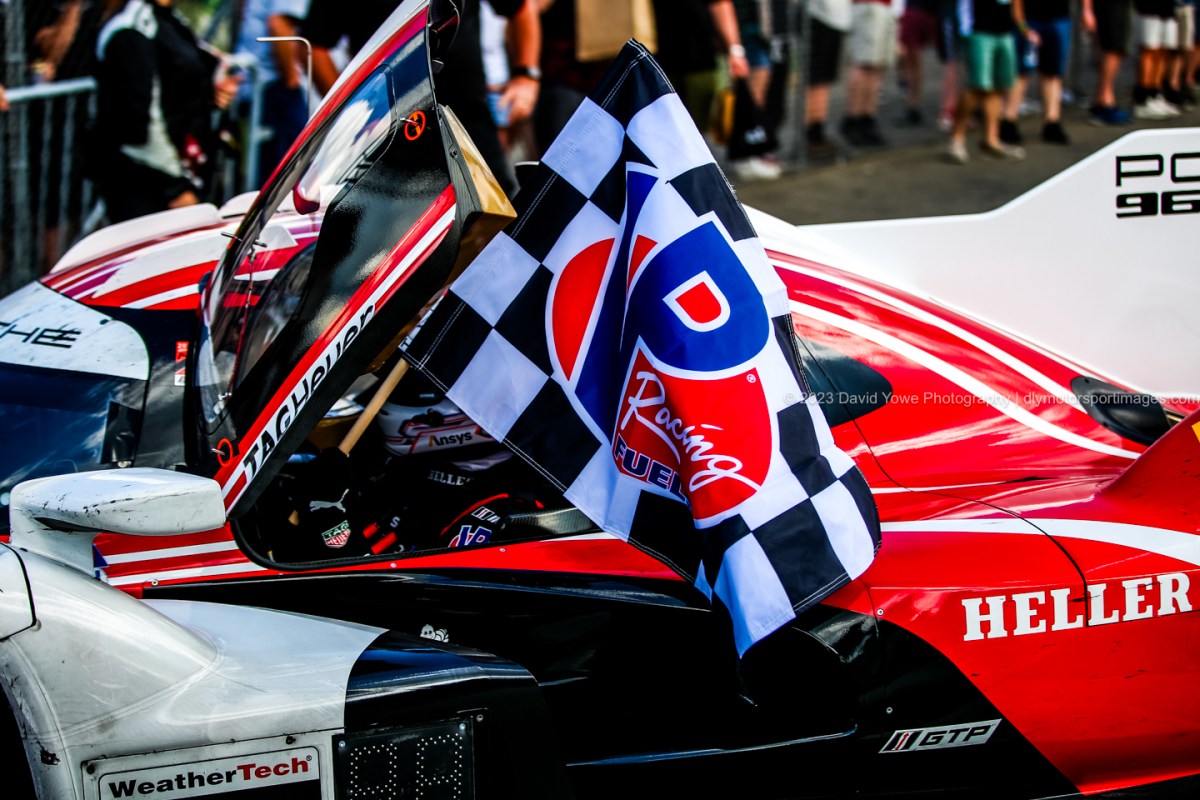 The VP Racing flag flying from the cockpit of the winner of the 6 hours of the Glen, the #6 Porsche Penske Motorsport Porsche 963.