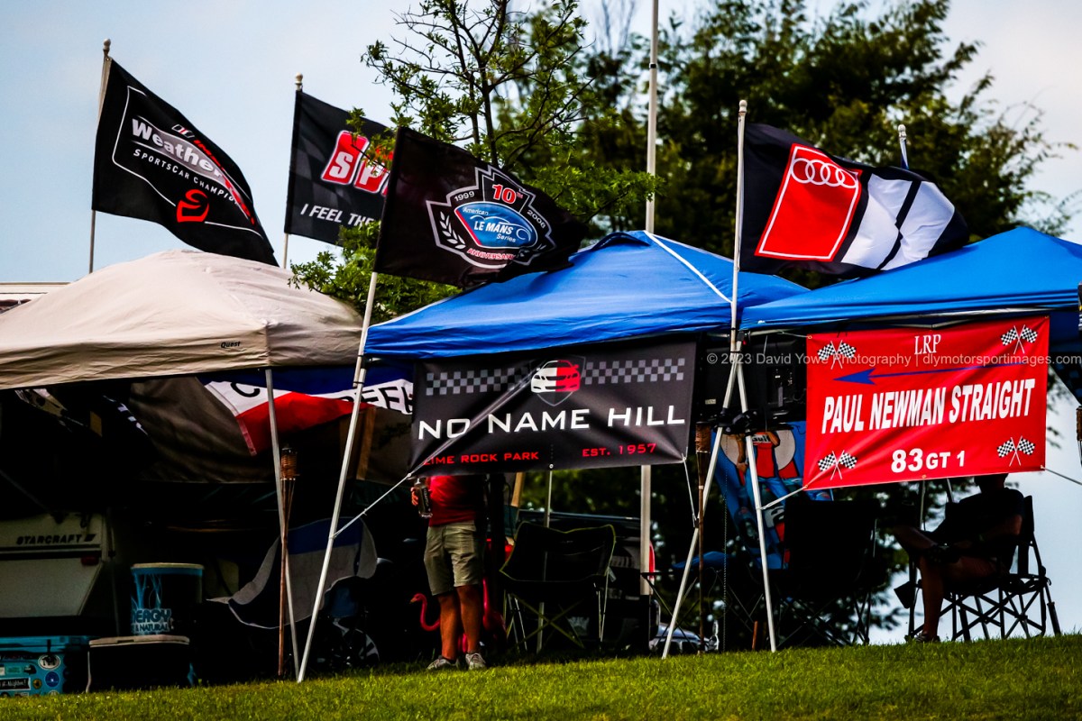 Before the 2:45 pm, practice session 2 for the WeatherTech Championship started, was looked up at the spectator hill, and saw some cool flags and signage on these tents.