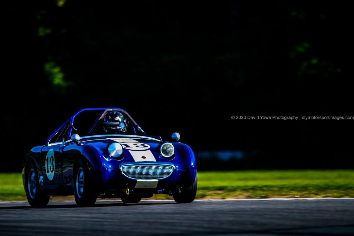 Headed along the inside of the track, along the short straight between the entrance to the Esses and the Lefthander for the 4.25 pm Mid-Century GT / Sportscars Under 2 Litre practice session. A 1960 Austin Healey Sprite Mk I.