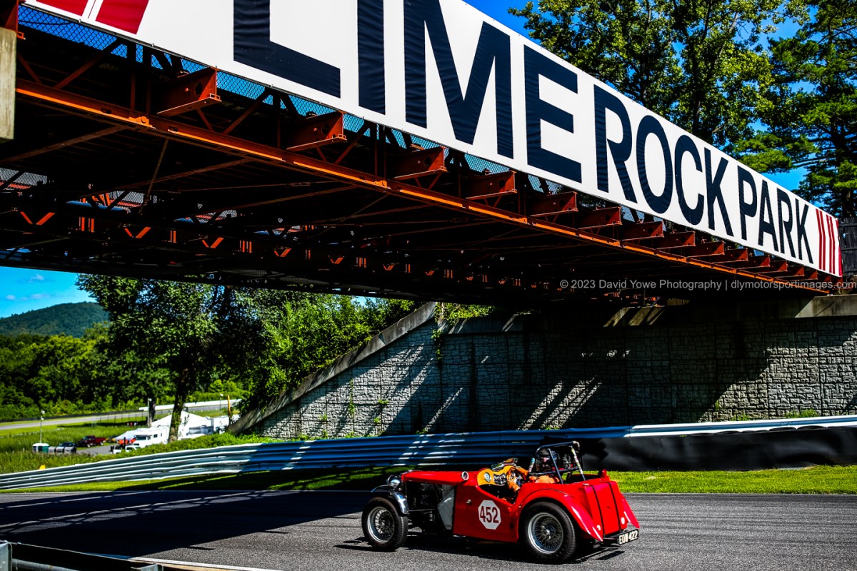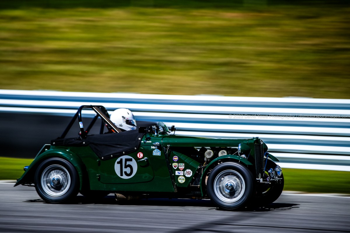 Then walked over to the outside of the top of the Downhill. First took some shots of the cars going underneath the bridge, with the Lime Rock Park signage above. For this shot used a wide angle lens and a fast shutter speed of 1/2000 sec and timed the shutter release to capture the cars, just as they went under the bridge. A 1947 MG TC during the War Era: Pre-War & Early Post-War practice session.