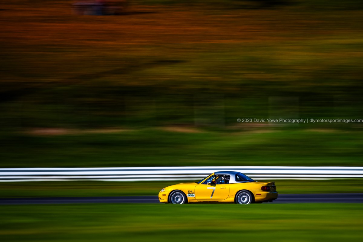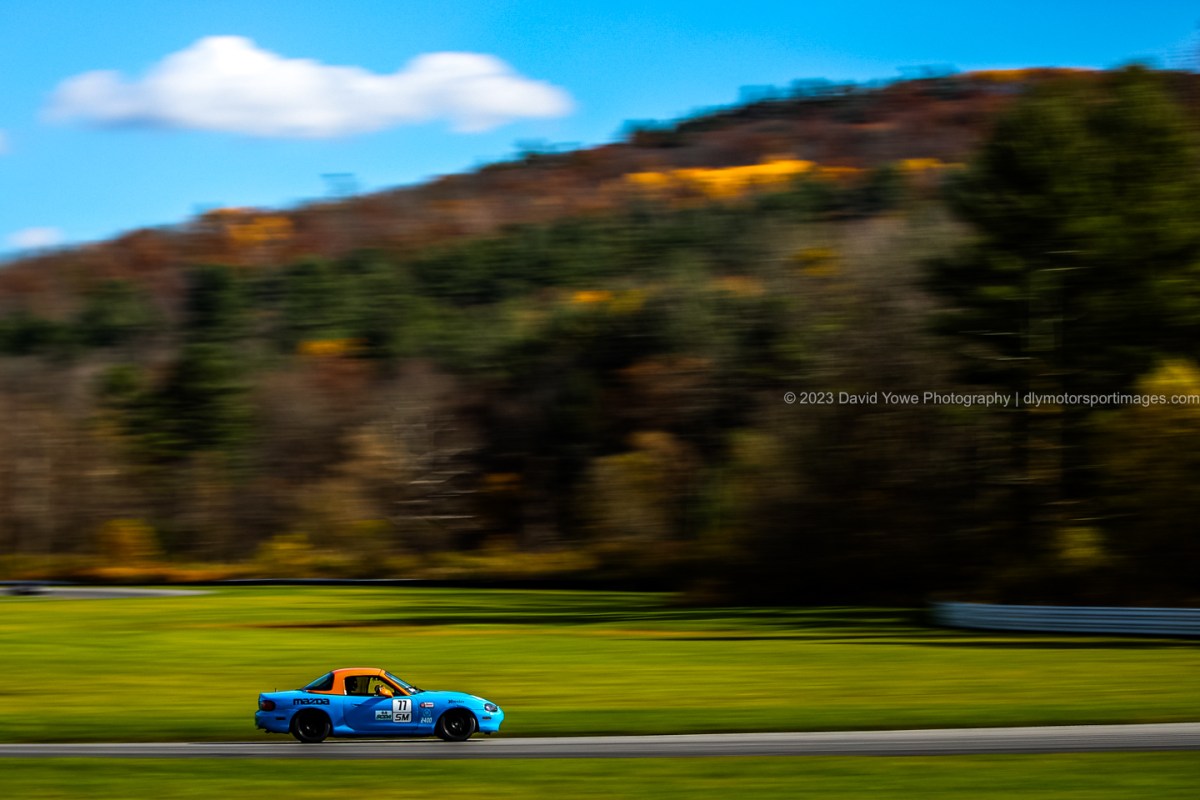 Arrived at the track early morning, and was greeted by some beautiful low and soft light, illuminating a pair of Miata’s, with fall colors in the background. Was thinking how it was great to be able to attend an event at Lime Rock Park during the fall, so could experience this track against beautiful autumn colors.