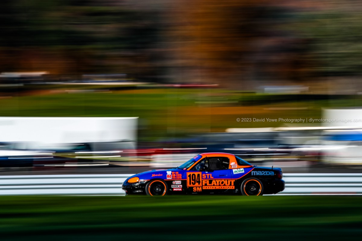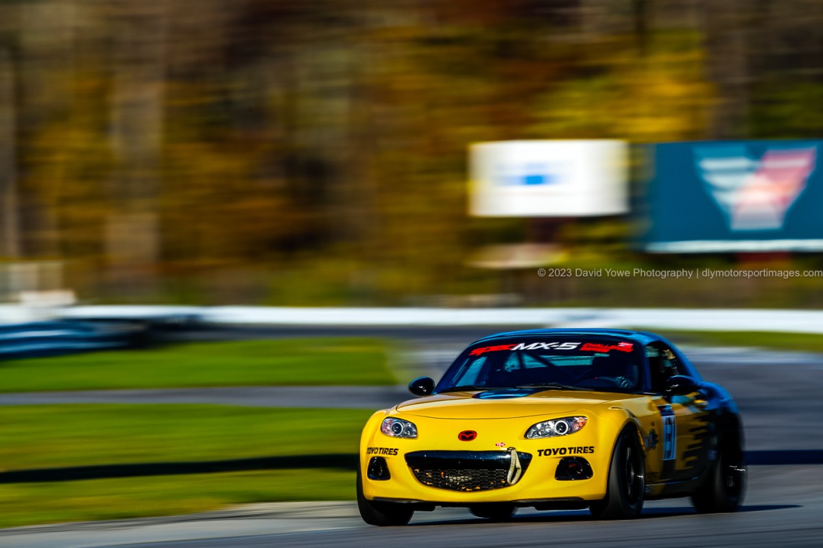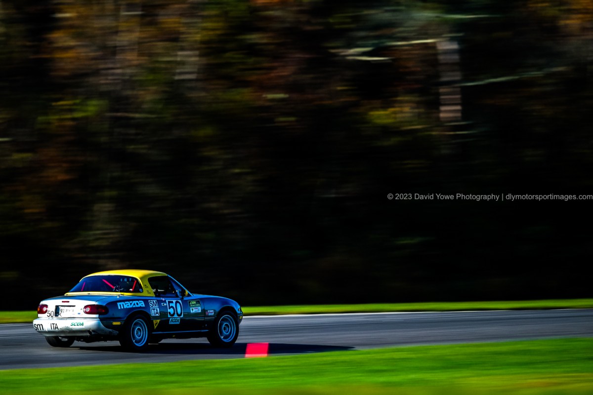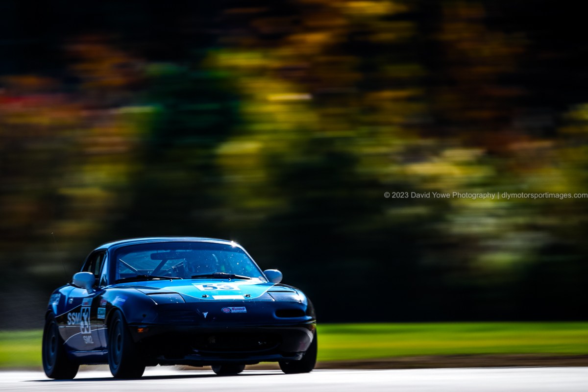 It wasn’t long until the Miata’s hit the track for the first race. Here’s a series of photos of the cars coming down Sam Posey Straight, around and out of Big Bend. The session was amazing, with beautiful layers of light and shadows, backdropped with the fall colors from the tree’s behind.