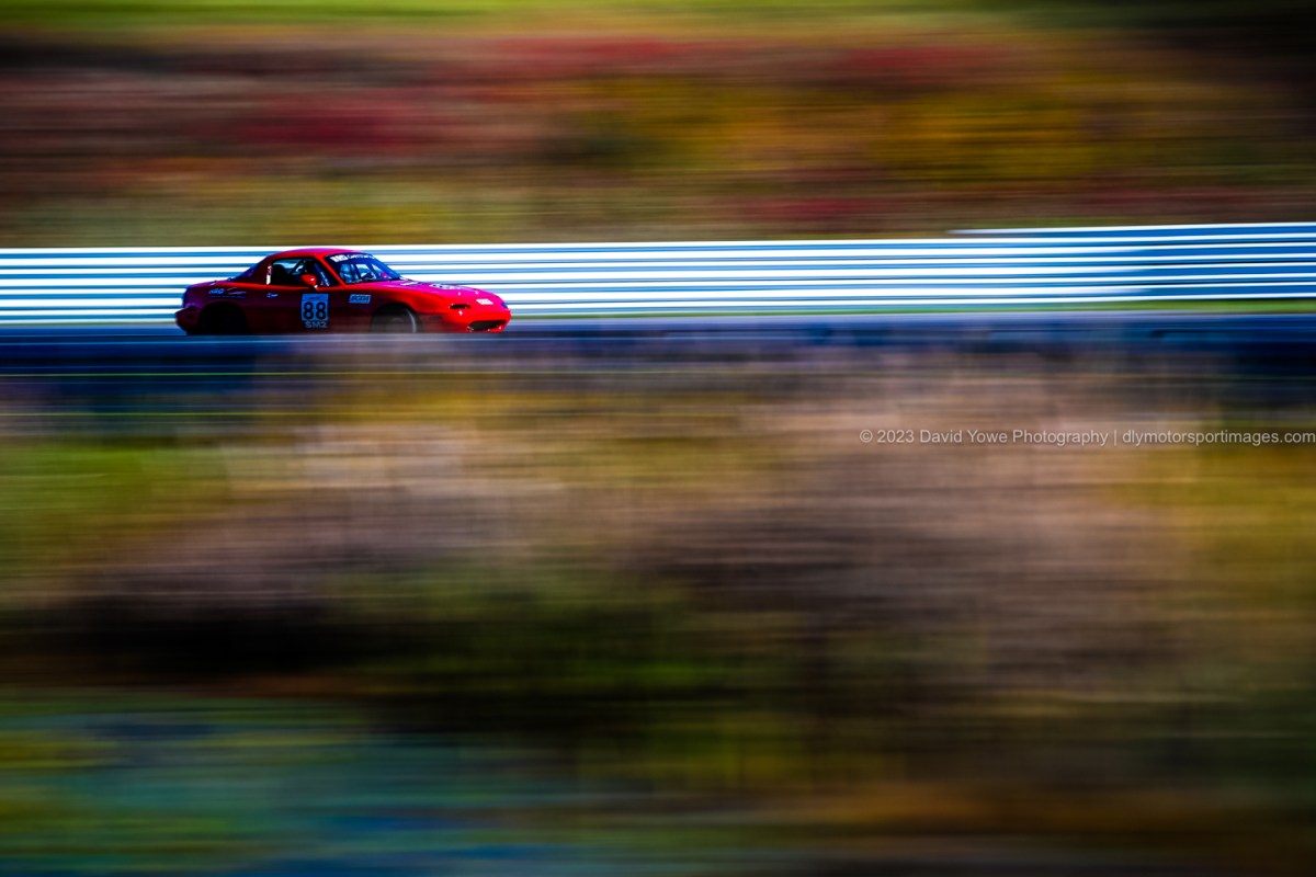 After getting the front straight shots, walked over to the inside of Big Bend and noticed bushes and trees lining the inside and outside of the track, and how this would be a great “autumn frame” for the cars speeding along the track. So tried some low shutter speed shots, and managed to capture a couple.