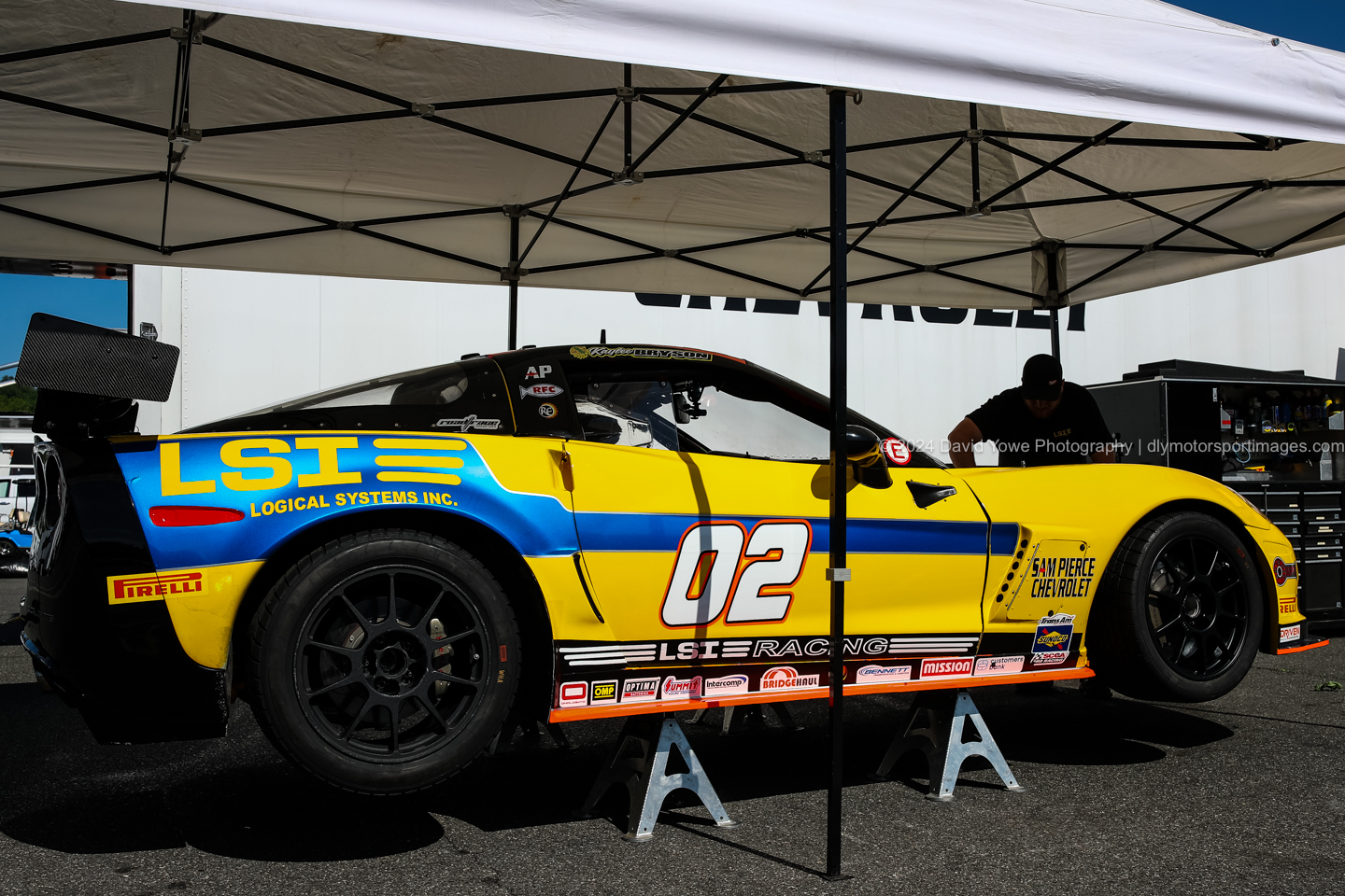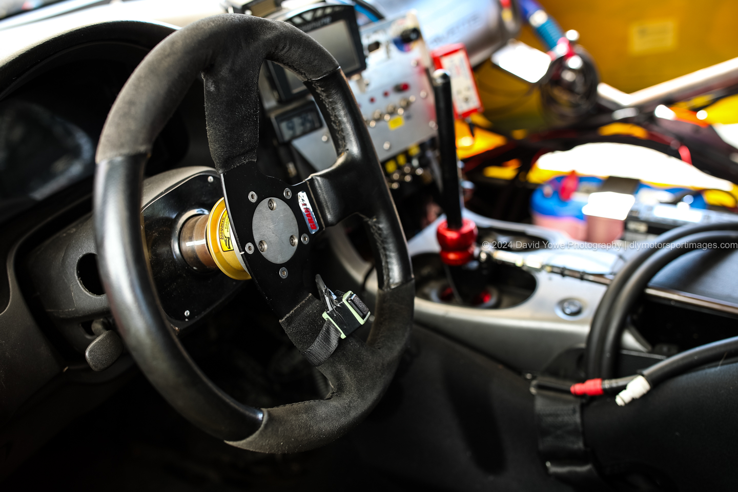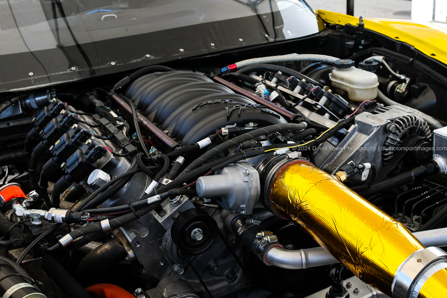 The #02 Chevrolet Corvette on car stands. Many thanks to the mechanic who let me get some photos of the engine bay and interior of the car.