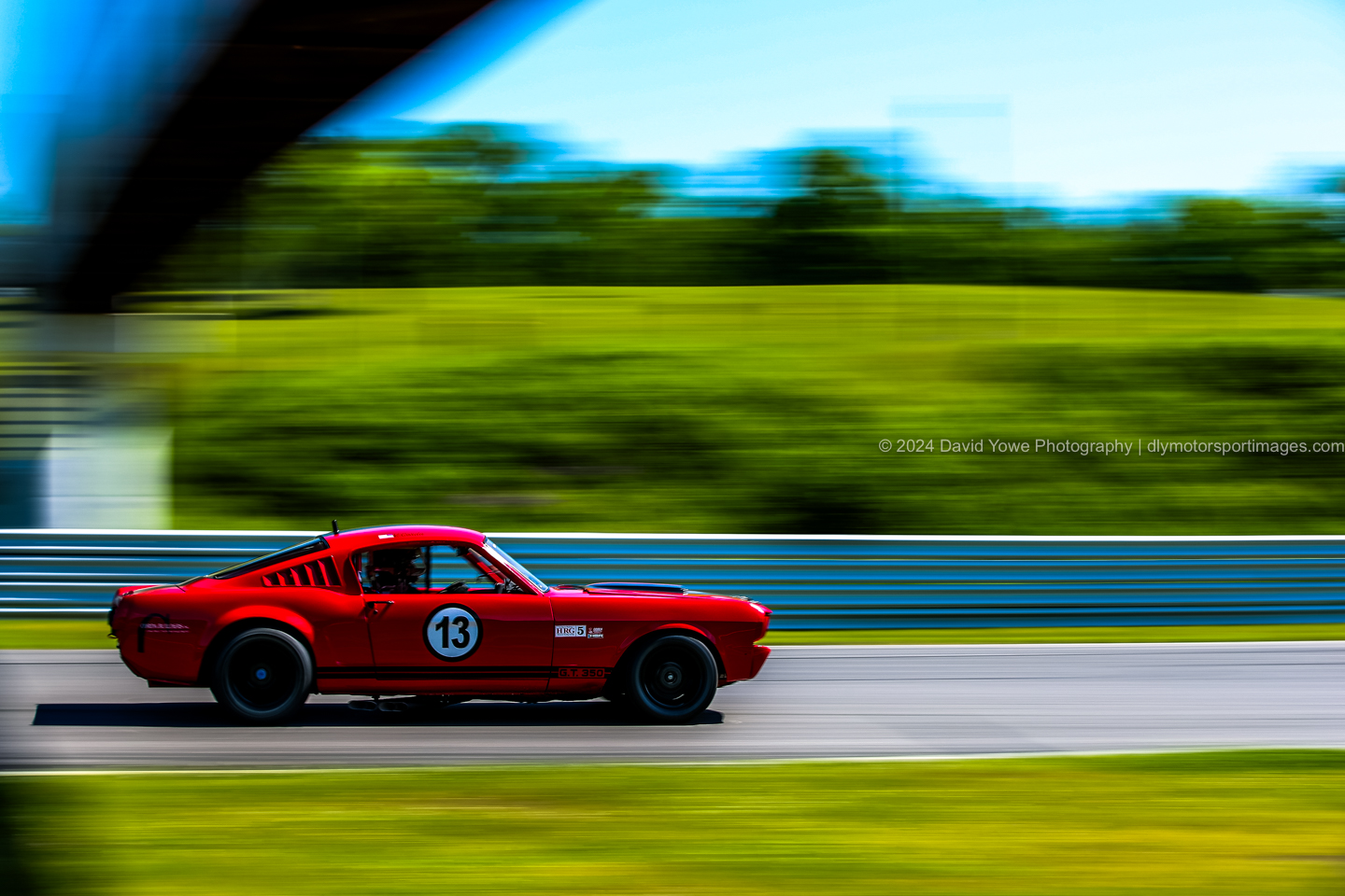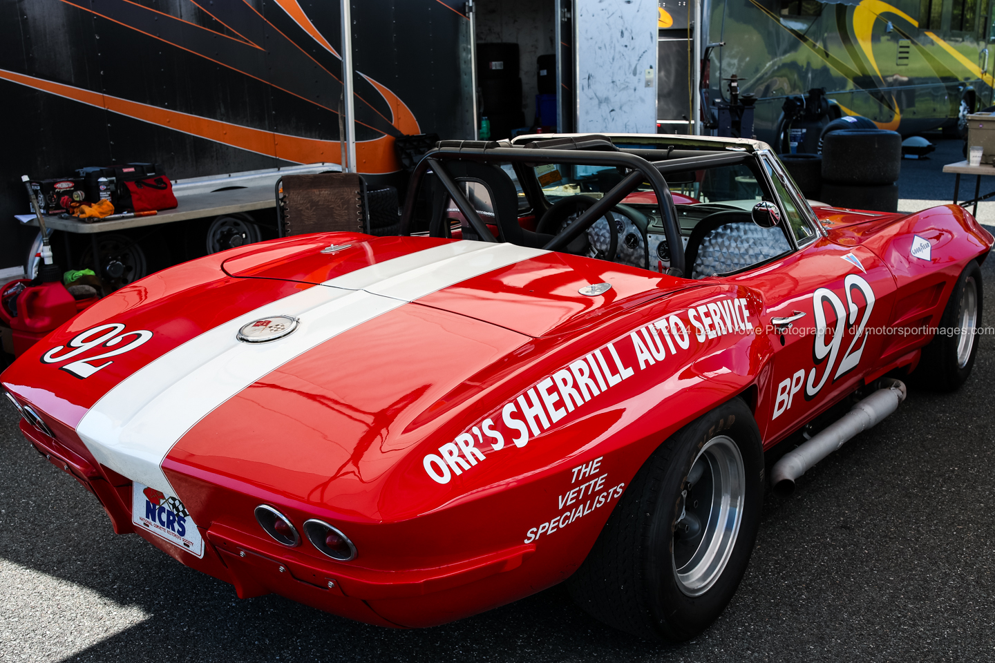 Went back up the side of the Down Hill, and watched the SVRA cars descend, then go around Turn 7 into Sam Posey Straight. Decided to try to capture this. For the photo above, needed to anticipate when the cars would descend the Down Hill, since their wasn’t enough time to watch for the cars, put the camera viewfinder to your eye, then track the car and take the photo. So instead, kept the camera viewfinder to my eye, listened for the car, then immediately panned the camera in the direction where I thought the car was traveling using back-button focus (which enabled me to pre-focus, so the AF wouldn’t be distracted by the trees the car was traveling behind). Missed a lot of photos, but managed to get a couple. A 2016 Porsche Cayman GT4 Clubsport.