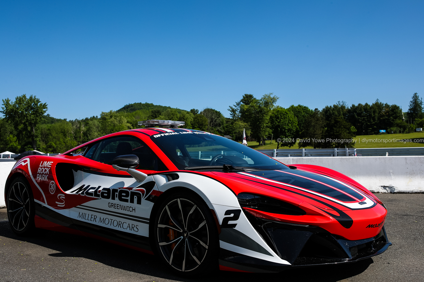 About half-way along the A Paddock, walked over to the other side of the paddock and saw the stunning McLaren Lime Rock Park pace car in red, white and black livery.