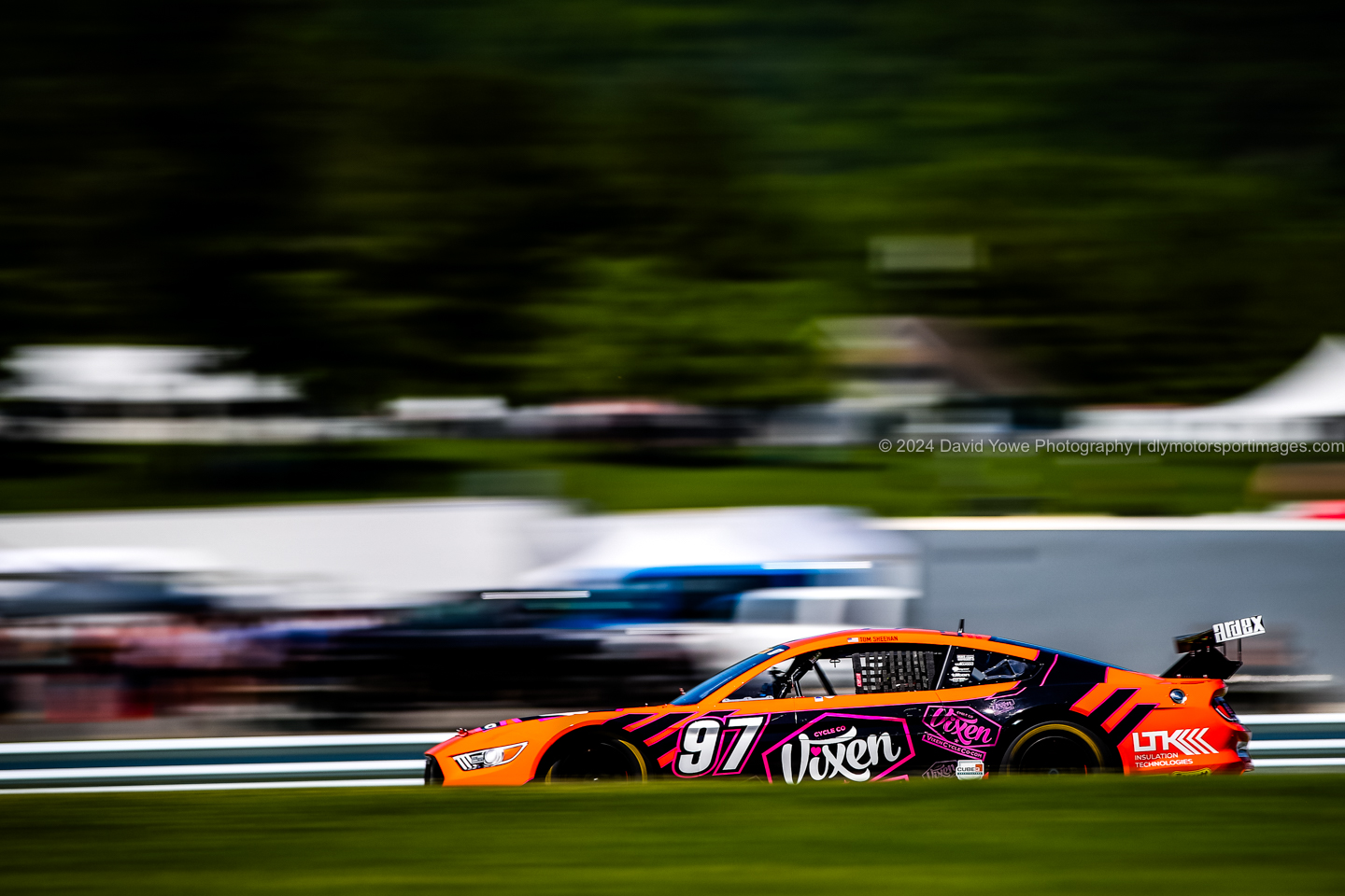 The #97 VixenMotorcycles / LTKInsulation Ford Mustang speeding past the A Paddock in the background.