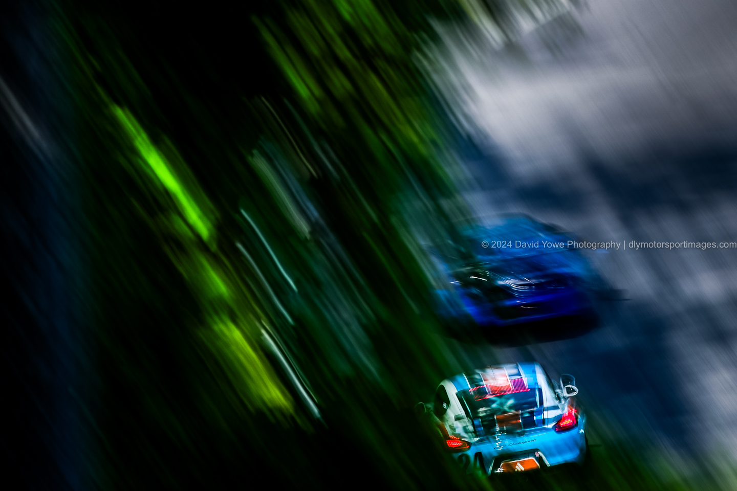 Using a long lens you can track the cars as they navigate through the Esses with side, front and 3/4 front panning photos. Really liked the dinosaur teeth livery on the front of the #17 Porsche (middle).