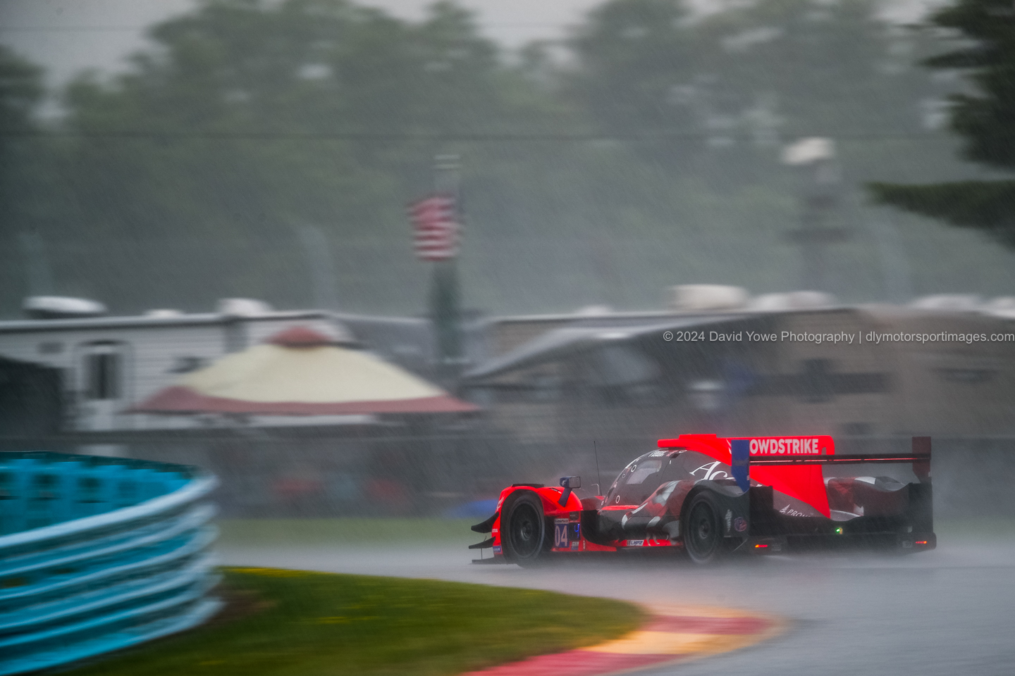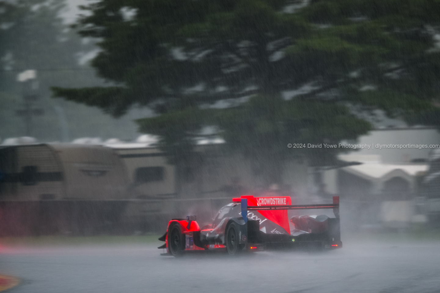 Looked up, and could see the sky was getting very dark, so checked the weather report on my iPhone. Rain was expected soon, so went back to the car and put a rain cover on my camera and lens, and put on a rain jacket. Drove over to the outside of The Boot and walked though the pedestrian tunnel under the Turn 8 to 9 straight to get to the inside of The Boot. It wasn’t long until the rain poured down. Here’s a series of photos of the #04 CROWDSTRIKE RACING BY APR ORECA LMP2 07 to give you an idea of how much rain was coming down. A few laps later, the race was red flagged, so found some trees for cover.