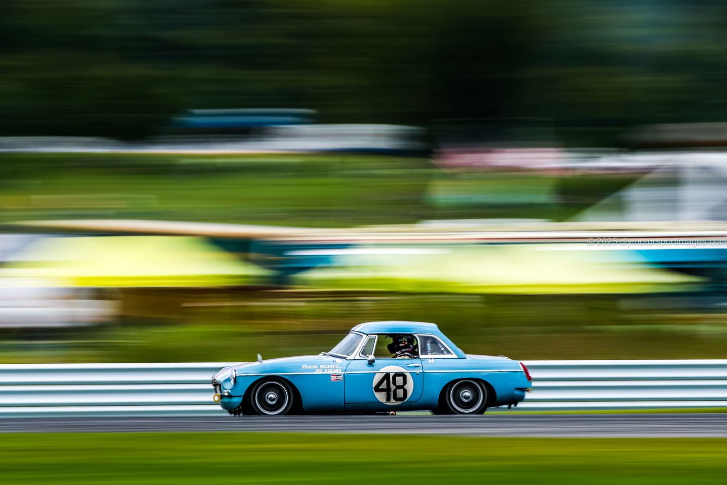 For the first track session of the day, Group 1 practice 1, went to the outside of Big Bend. This class of cars consisted of Mid-Century GT / Sportscars under a 2 liter engine capacity. First captured the cars speeding down Sam Posey Straight, then turning into Big Bend. A 1962 MG B (top), 1974 Fiat X1/9 (middle) and a 1957 MG A Coupe (bottom).