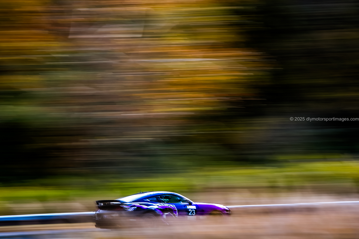 After panning the cars, walked further along The Back Straight for front photos of the cars as they hit the top of the Uphill, with the beautiful fall leaves above, illuminated by the morning sunlight.